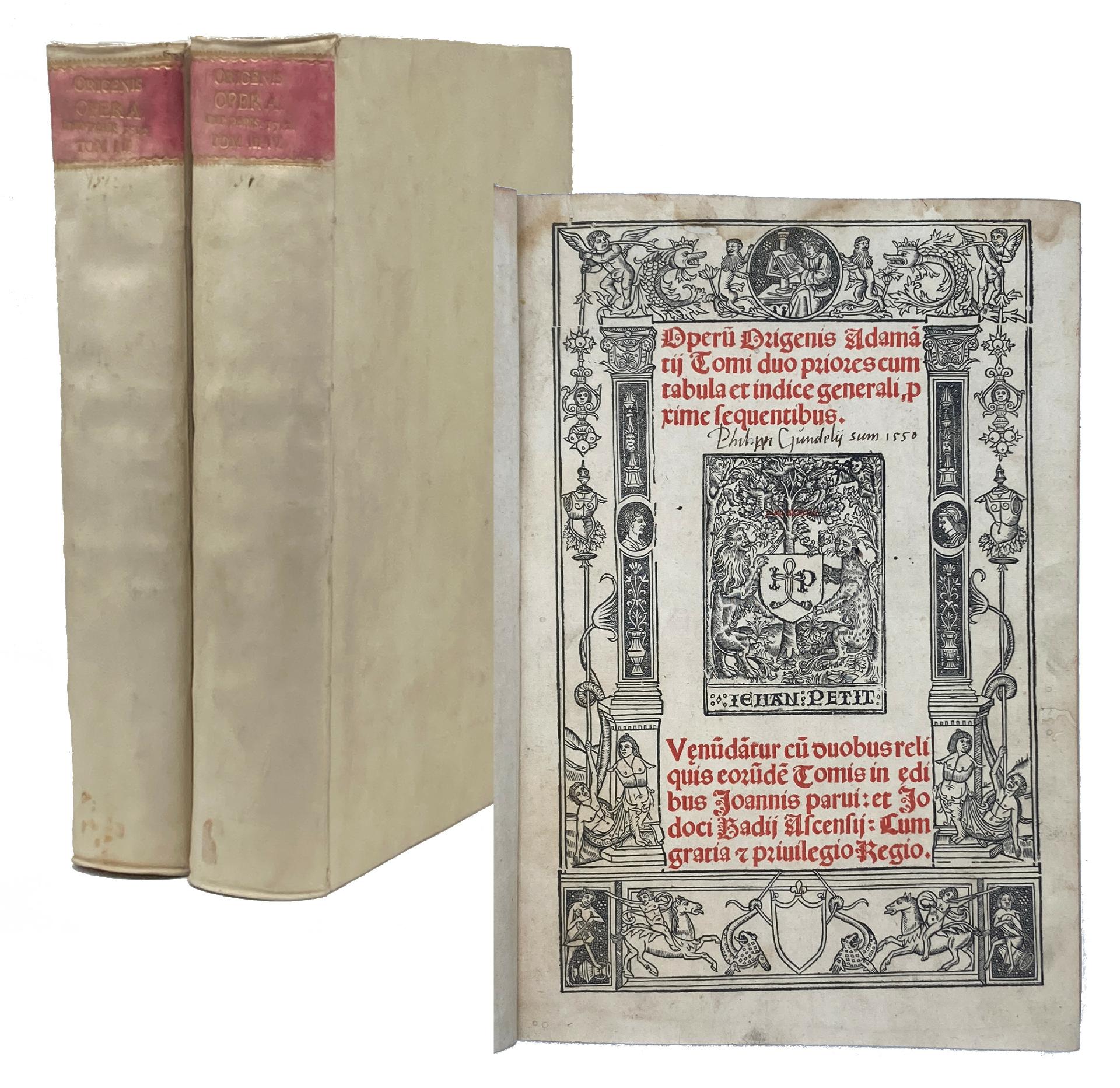 Origenis Adamanti. Operum Origenis Adamantij [...] cum Tabulis & Indice generali proxime sequentibus. 4 Tle. in 2 Bde. (alles). Paris, Jehan [Jean] Petit, 1512. Folio (30,5 x 21cm), mit 3 (2 zweifarbigen) Titeln mit Holzschnittbordüre, Holzschnittdruckermarke und zahlreichen Holzschnittinitialen, Titel, 31 Bll., CXC; CLVI; Titel, 5 Bll., CCXXIIII; Titel, 1 Bl., CLXXV, spät. Pgmt. mit RS. Ehem. Exemplar aus der Bibliothek des Grafen Christian Ernst zu Stolberg-Wernigerode mit dessen Exlibris auf den vorderen Spiegeln. Titel 1 mit hs. Namenzug des bekannten Humanisten Philipp Gundelius (1493-1567). Seltene frühe Drucke der Werke des Origenes von Alexandria (Origenes Adamantius, ca. 185–254 n. Chr.), eines frühen christlichen Gelehrten und Theologen und einer der bedeutendsten Autoren der frühen christlichen Kirche. - Vorliegende Druckvariante ohne den 2. Titel (so korrekt!). Einbände aus der 1. Hälfte des 18.Jh. (Bibl. Graf Stolberg-Wern.) nahezu ohne Gebrauchsspuren. Titel 1 bei Bindung für Graf Stolbergische Bibliothek komplett alt aufgezogen. Papier teils etwas gebräunt, vereinzelt etwas braunfleckig. Teils (zu Beginn) im weißen Rand etwas feuchtrandig. Titel 3 mit falsch angesetzter Papierreparatur (sehr klein). Teil 4 mit 2 kleineren Wurmlöchlein, wenige Blatt mit kurzem, schmalen Wurmgang ohne Textverlust. Insgesamt sehr schönes Exemplar. Bestell-Nr: 3-0-260..........zurückgestellt | ||