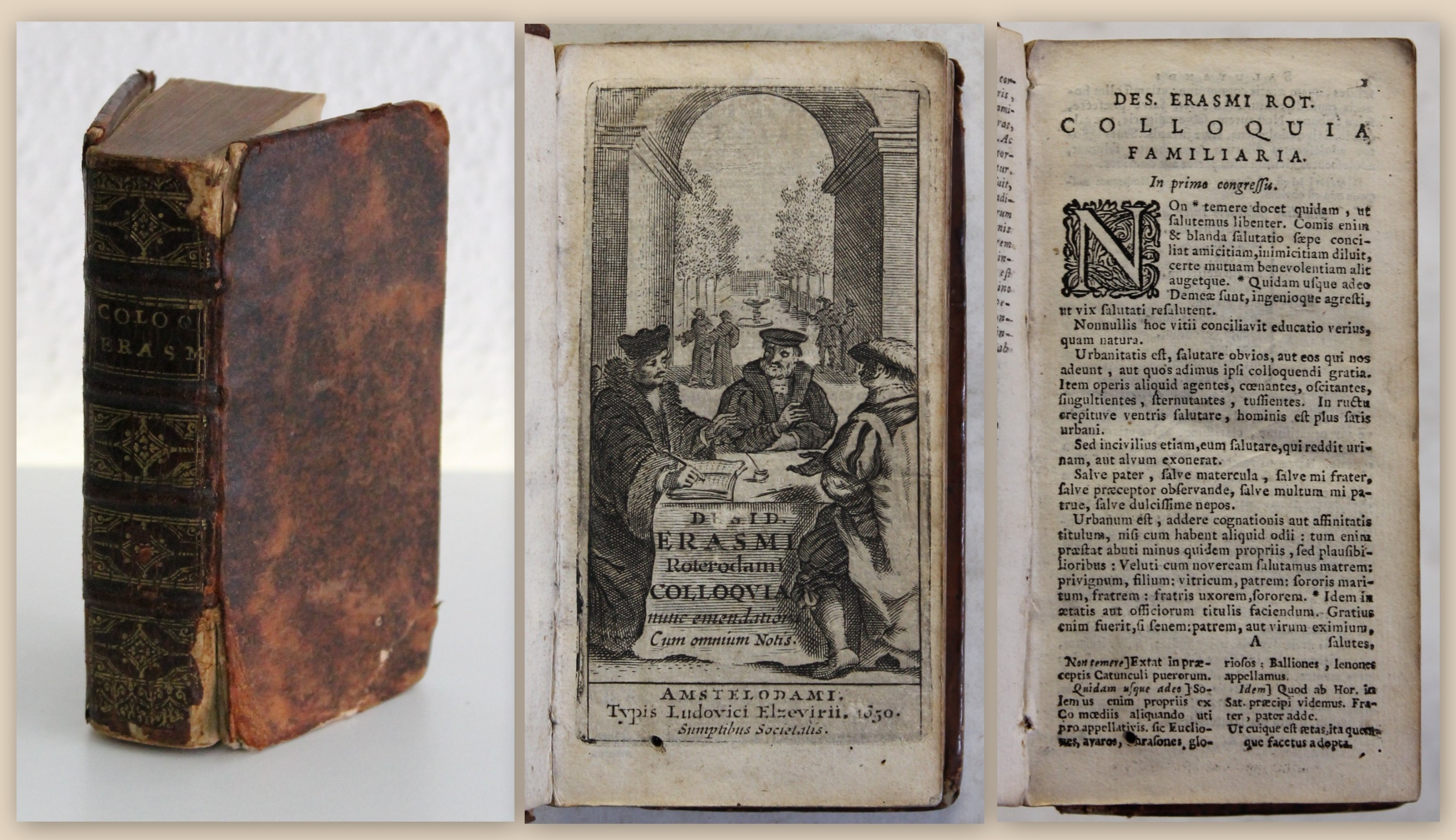 Erasmus von Roterdam. Des. Erasmi Roterod. Colloquia, nunc emendatiora.. Amsterdam, Ex officina Elzeviriana, 1662. 12°(14x9cm), Schnittgravur, gestochener Titel, 672 S., Pergamenteinband mit Goldprägung. Ebert I/ 6870 - Zweite Ausgabe aus der Officina Elzeviriana. Willems schreibt, dass die Ausgaben von 1662 und die nachfolgende von 1679 «Zeile für Zeile» mit der ersten Ausgabe von 1655 übereinstimmen. Der Amsterdamer Druck entspricht den Ausgaben von Bonaventura und Abraham aus den Jahren 1636 und 1643. - Einband berieben und bestoßen sowie angeschmutzt, hs. Rs., Goldverzierung am Rücken, florale Goldprägung auf Deckel, goldener Rundumschnitt mit floraler Schnittgravur Spiegel wurmspurig und mit Resten von Wachs versehen, erste und letzen 2 Seiten wurmspurig mit minimalem Textverlust, Papier altersbedingt gebräunt. Bestell-Nr: 3-0-180..........verkauft | ||