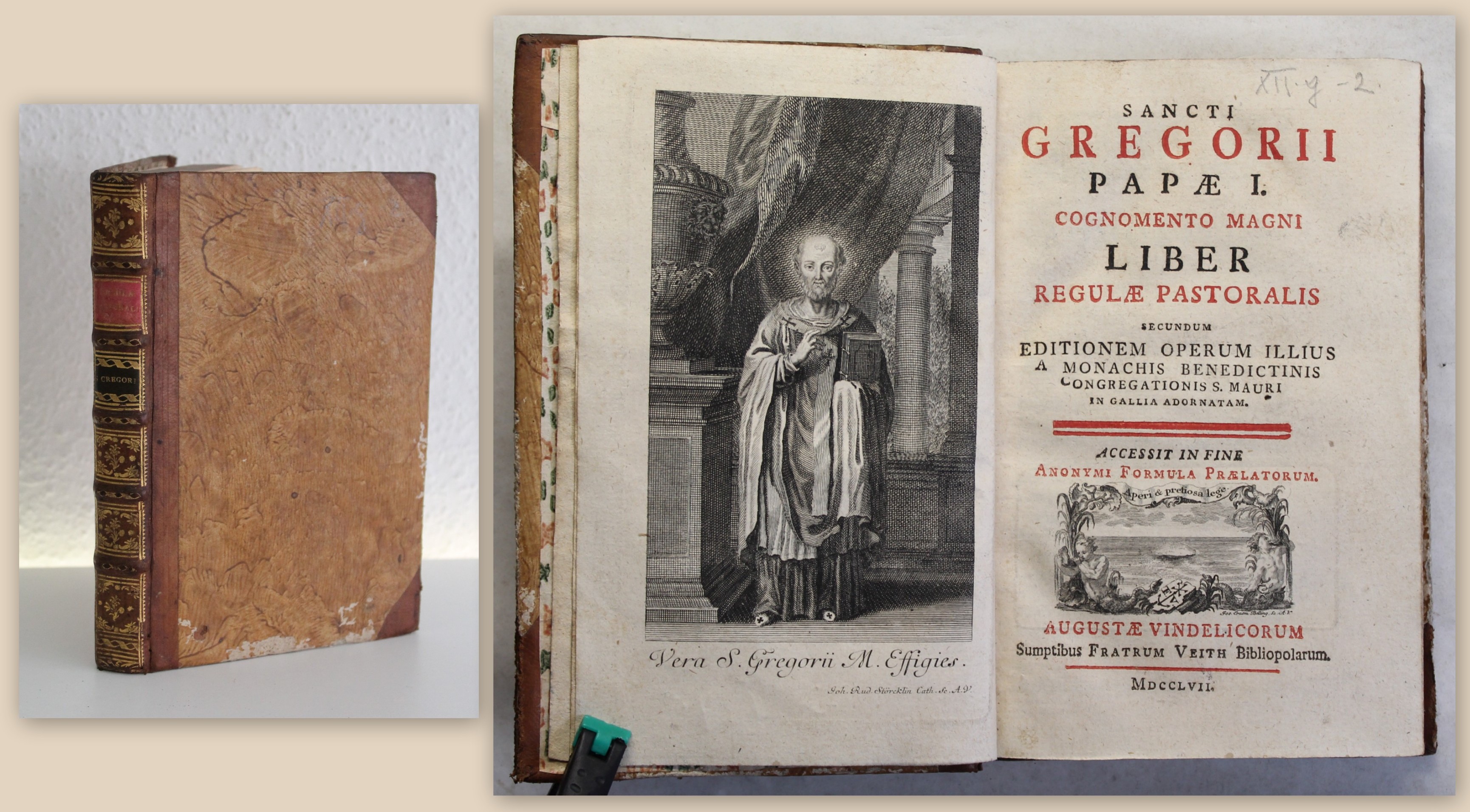 Papst Gregor. Sancti Gregorii Papae I. Cognomento Magni Liber regulae pastoralis [...]. Augustae Vindelicorum (Augsburg), Veith, 1757. 8°, mit gest. Frontispiz und gest. Titelvignette, XVI(1), 2 Bll., 243(1) S., 29 Bll., 2(w) Bll., HLdr. d. Zt. mit Flora goldgepr. Rücken und 2 RS. Der schöne Einband mit geringen Gebrauchspuren. Papier sauber. Sehr schönes Exemplar. Bestell-Nr: 3-0-29..........300,00 € (inkl. MwSt. zzgl. Versand) | ![]() | |