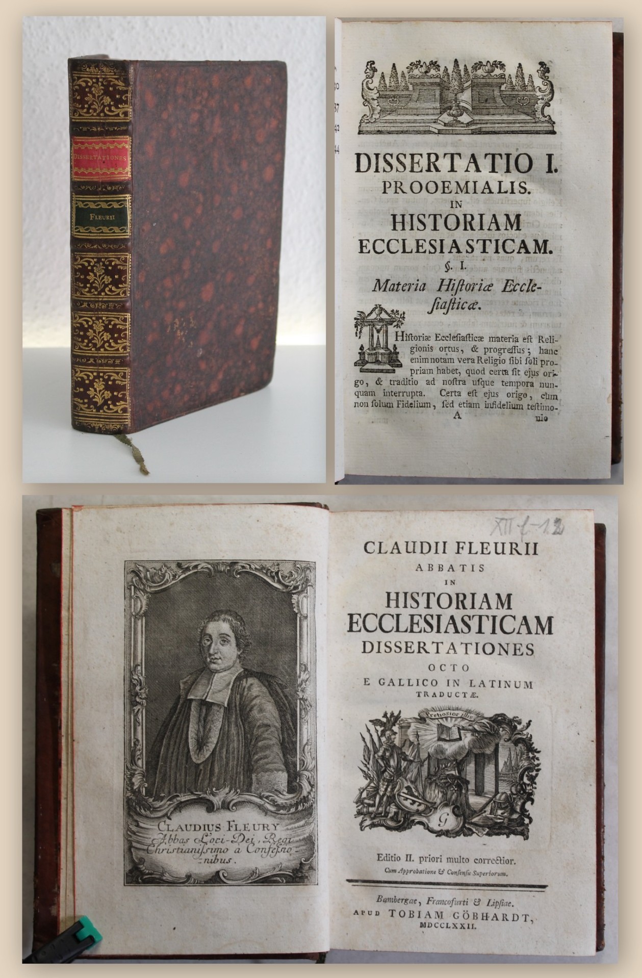 Fleury, Claude. Claudii Fleurii Abbatis in Historiam Ecclesiasticam Dissertationes octo e Gallico in Latinum traductae. Editio II. priori multo correctior [...]. Bamberg, Frankfurt, Leipzig, Tobias Göbhardt, 1772. gr. 8°, mit gest. Frontispiz (Portrait), 7 Bll., 448 S., Ldr. d. Zt. mit floral goldgepr. Rücken und 2 RS. Einband nahezu ohne Gebrauchsspuren. Papier leicht gebräunt, vereinzelt etwas braunfleckig. Sehr schönes Exemplar. Bestell-Nr: 3-0-31..........150,00 € (inkl. MwSt. zzgl. Versand) | ![]() | |
