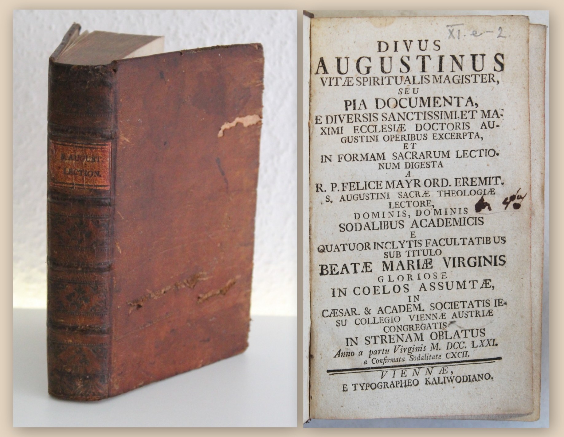 Mayr, Felix. Divus Augustinus Vitae Spiritualis Magister Seu Pia Documenta E Diversis Sanctissimi, Et Maximi Ecclesiae Doctoris Augustini Operibus Excerpta, Et In Formam Sacrarum Lectionum Digesta ; Dominis, Dominis Sodalibus Academicis E Quatuor Inclytis Facultatibus Sub titulo Beatae Mariae Virginis Gloriose In Coelos Assumtae, In [...]. Wien, Kaliwoda, 1771. 8°, 4 Bll., 464 S., Ldr. d. Zt. VD18 12677361-001 - Einband berieben, etwas bestoßen und beschabt sowie mit kl. Wurmgang auf vorderem Deckelbezug.Papier altersbedingt etwas gebraunt, vereinzelt leicht braunfleckig. Vorsatz und Titel mit altem hs. Besitzeintrag. Innengelenke je mit kleiner Wurmspur oben. Gutes Exemplar. Bestell-Nr: 3-0-33..........verkauft | ![]() | |