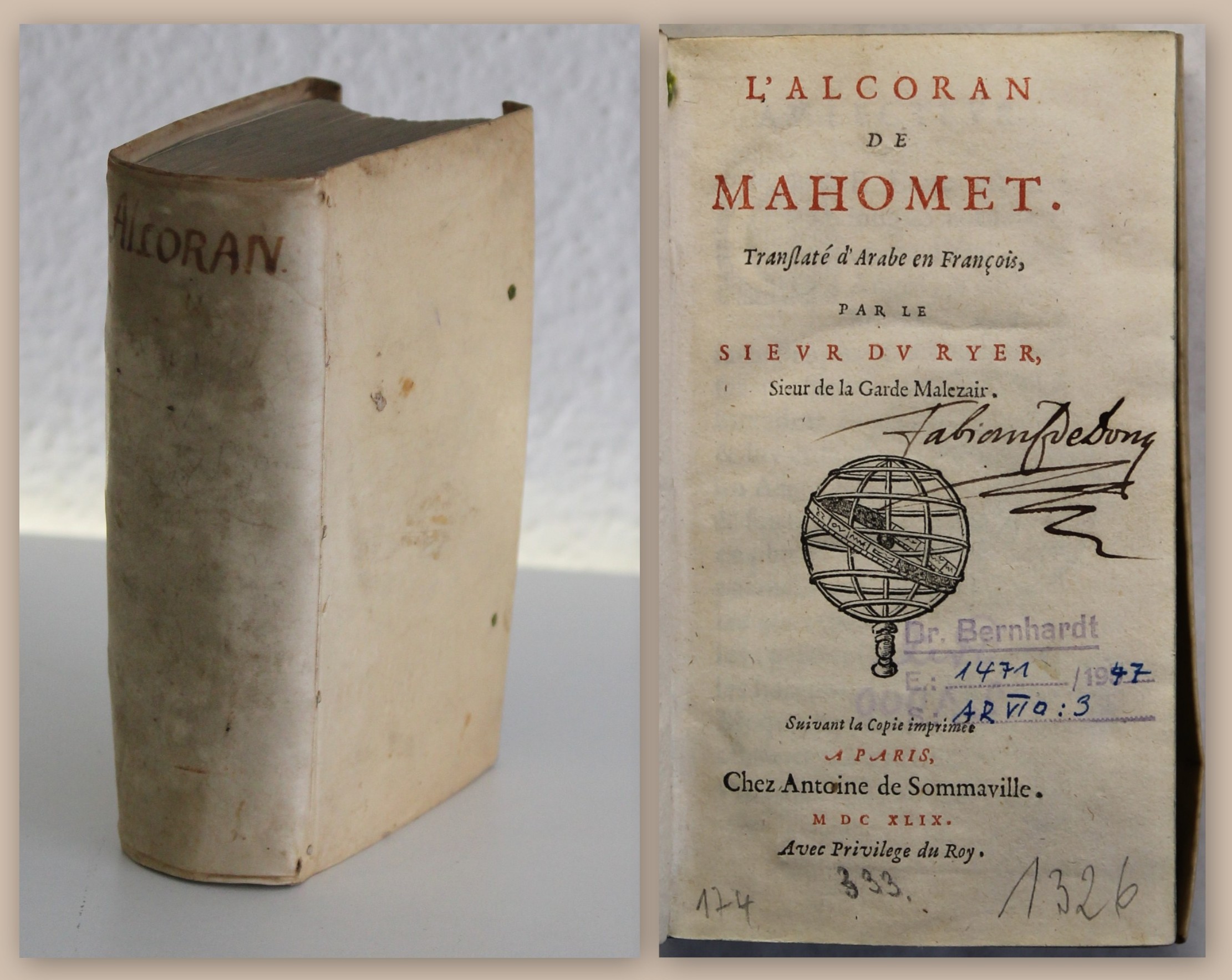 du Ryer, Andreas. L' Alcoran de Mahomet. Translaté d' Arabe en François par le Sieur Du Ryer. Sieur de la Garde Malezair. Paris, Antoine de Sommaville, 1649. kl. 8°, mit Druckermarke und einigen Initialen, 6 Bll., 686 S., 3 Bll., Pgmt. d. Zt. mit hs. Rückentitel. Brunet III, 1309; Graesse IV, 44NA - 2. Ausgabe. Einband gering gebräunt und gering fleckig, alte Schließenbänder entfernt. Papier sauber, Titel recte und verso mit altem Besitzstempel, recte mit altem hs. Namenzug. Vorderer Spiegel mit altem Bibliotheksstempel und Bibliotheksaufkleber. Schönes Exemplar. Bestell-Nr: 3-0-34..........verkauft | ![]() | |