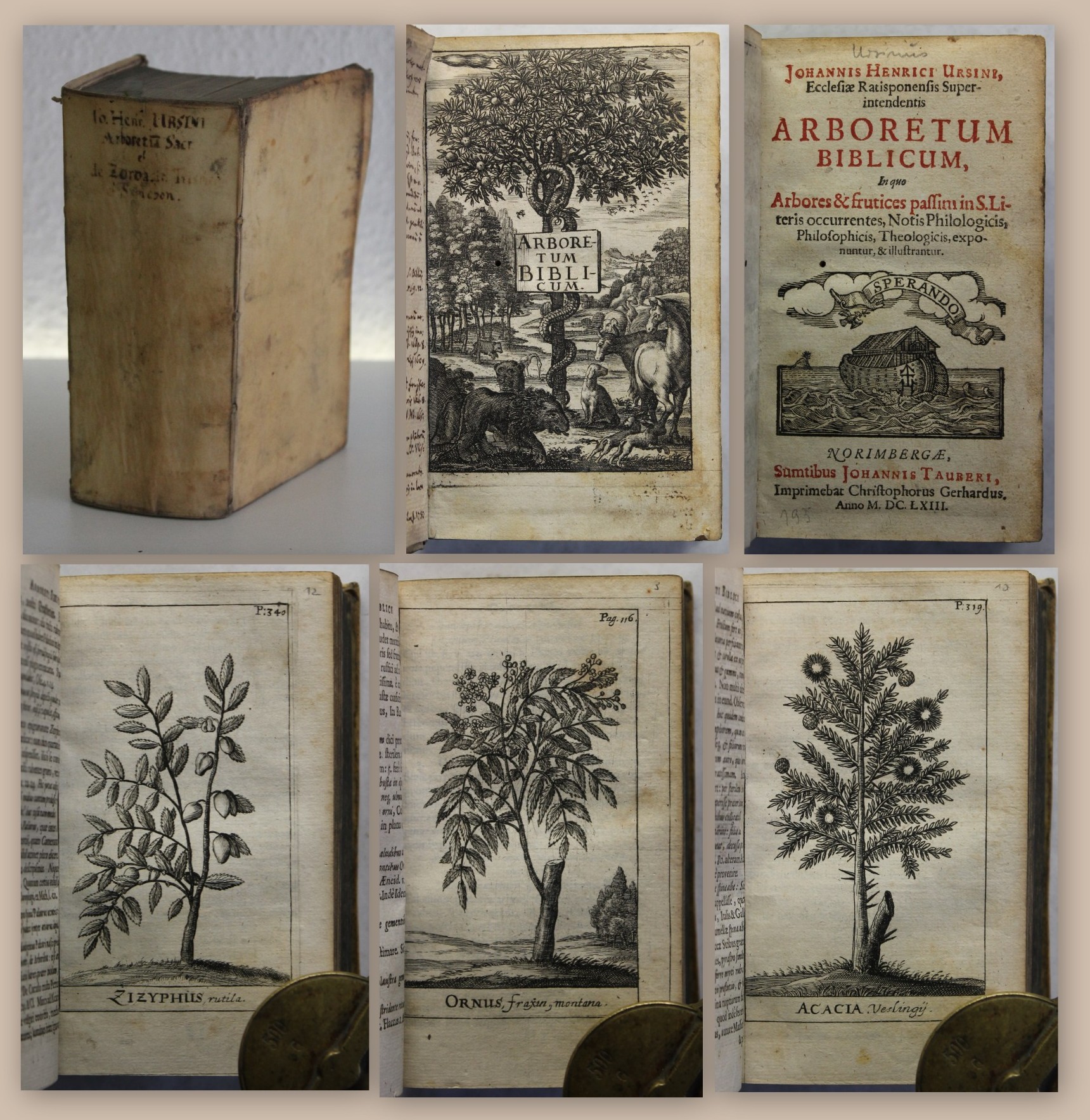Ursinus, Johann Heinrich. Sammelband mit 2 Schriften in erster Ausgabe. 1) Johannis Henrici Ursini, Ecclesiæ Ratisponensis Superintendentis Arboretum Biblicum, In quo Arbores & frutices passim in S. Literis occurrentes, Notis Philologicis, Philosophicis, Theologicis, exponuntur, & illustrantur [...], angeb. ders.: 2) Joh. Henrici Ursini De Zoroastre Bactriano, Hermete Trismegisto, Sanchoniathone Phoenicio, eorumq. scriptis, & aliis, contra Mosaicae scripturae antiquitatem : exercitationes familiares : quibus Christophori Arnoldi Spicilegium accessit [...]. Nürnberg, Tauber / Endter, 1663 / 1661. 8°, mit gest. Titel, 16 gest. Tafeln und 1 Holzschnittvignette, 2(w), 8 Bll., 621(1) S., 1 Bl.; 8 Bll., 240 S., 71 S., Pgmt. d. Zt. Pritzel 9638 (1); Caillet 10946 & Rosenthal 867 (2) - Einband berieben, bestoßen und etwas angeschmutzt. Pergamentkante des vorderen Deckels etwas aufgebogen. Vorsatz und Titel von 2) verso mit alten hs. Notizen. Papier etwas gebräunt, teils etwas fleckig. Zu Beginn (bis Seite 25 des ersten Titels) mit winzigem Wurmloch ohne Textverlust. Wohl erhaltenes Exemplar . Bestell-Nr: 3-0-35..........reserviert | ![]() | |