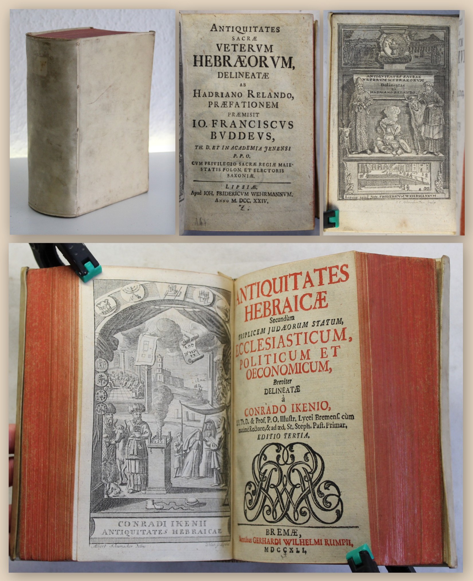 Sammelband Judaica. 1) Reeland, Hadrian / Buddeus, Joh. Franc. Antiquitates Sacrae Vetervm Hebraeorvm / delineatae ab [...]. angeb. 2) Iken, Conrad. Antiquitates Hebraicae secundum triplicem Judaeorum statum, ecclesiasticum, politicum et oeconomicum [...]. Leipzig / Bremen, Friedrich Wehrmann / Gerhard Wilhelm Rump, 1724 / 1741. 8°, mit 2 gest. Frontispizen, 7 Bll., 496 S., 32 Bll.; 7 Bll., 624 S., 56 Bll., Pgmt. d. Zt. Fürst III, 150 (1); Fürst II, 90 (2) - Die Frontispize mit Darstellungen der jüdischen Heiligtümer, Kultgeräte und Riten. Einband mit minimalen Gebrauchsspuren. Papier minimalst gebräunt. Titel 1 verso mit altem Bibliotheksstempel, Vorsatz mit altem Besitzstempel. Sehr gutes Exemplar. Bestell-Nr: 3-0-36..........verkauft | ![]() | |