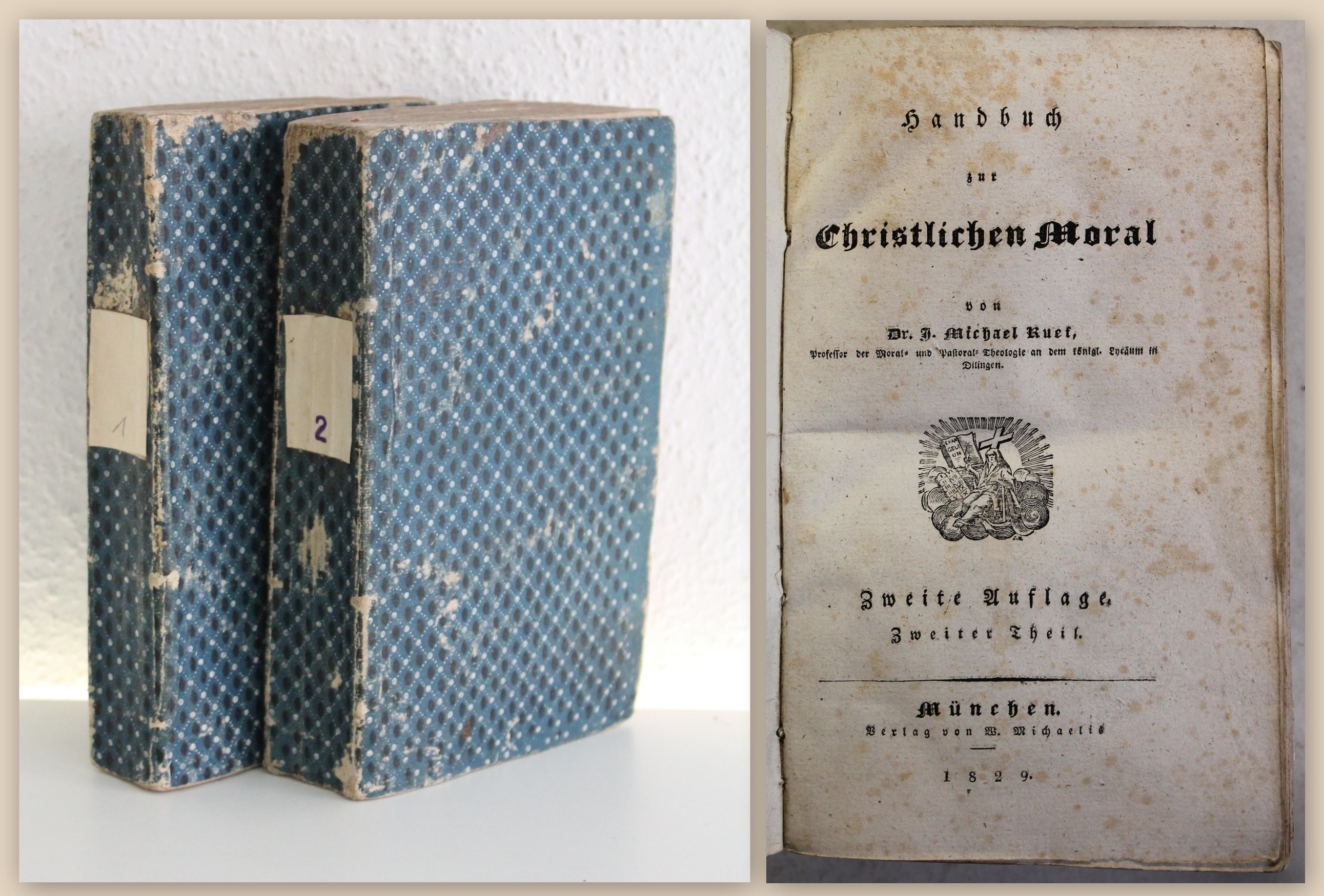 Ruf, Dr. Johann Michael. Handbuch zur Christlichen Moral. 2 Bd. (alles). Zweite Auflage. München, W. Michaelis, 1829. gr. 8°, VI, 2 Bll., 478 S.; 8 Bll., 550 S., Interimsbroschur. Ruf behandelt u.a. Sünden und Laster, Aberglauben, Häreticismus. Einbände berieben und etwas bestoßen, mit neueren RS versehen. Papierbedingt vereinzelt leicht gebräunt und vereinzelt etwas braunfleckig.. Bestell-Nr: 3-0-38..........130,00 € (inkl. MwSt. zzgl. Versand) | ![]() | |
