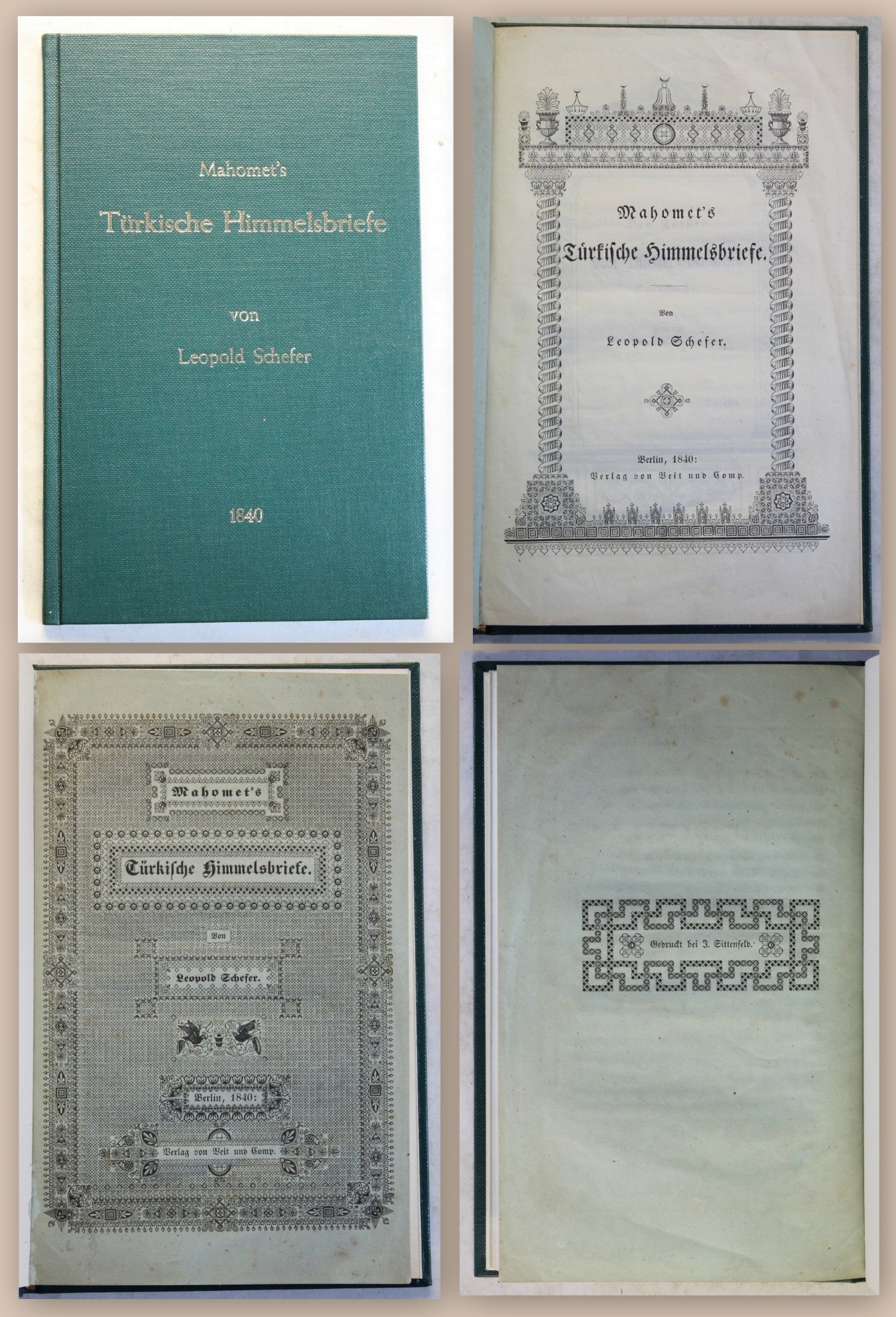 Schefer, Leopold. Mahomet's Türkische Himmelsbriefe. Berlin, Veit und Comp., 1840. gr. 8°, mit lithografiertem Titel, lith. Umschlag und lith. Buchschmuck (Seitenrahmen), neuer Ln. mit eingebundener OBrosch. Vereinzelt etwas braunfleckig. Gutes Exemplar. Bestell-Nr: 3-0-39..........verkauft | ![]() | |
