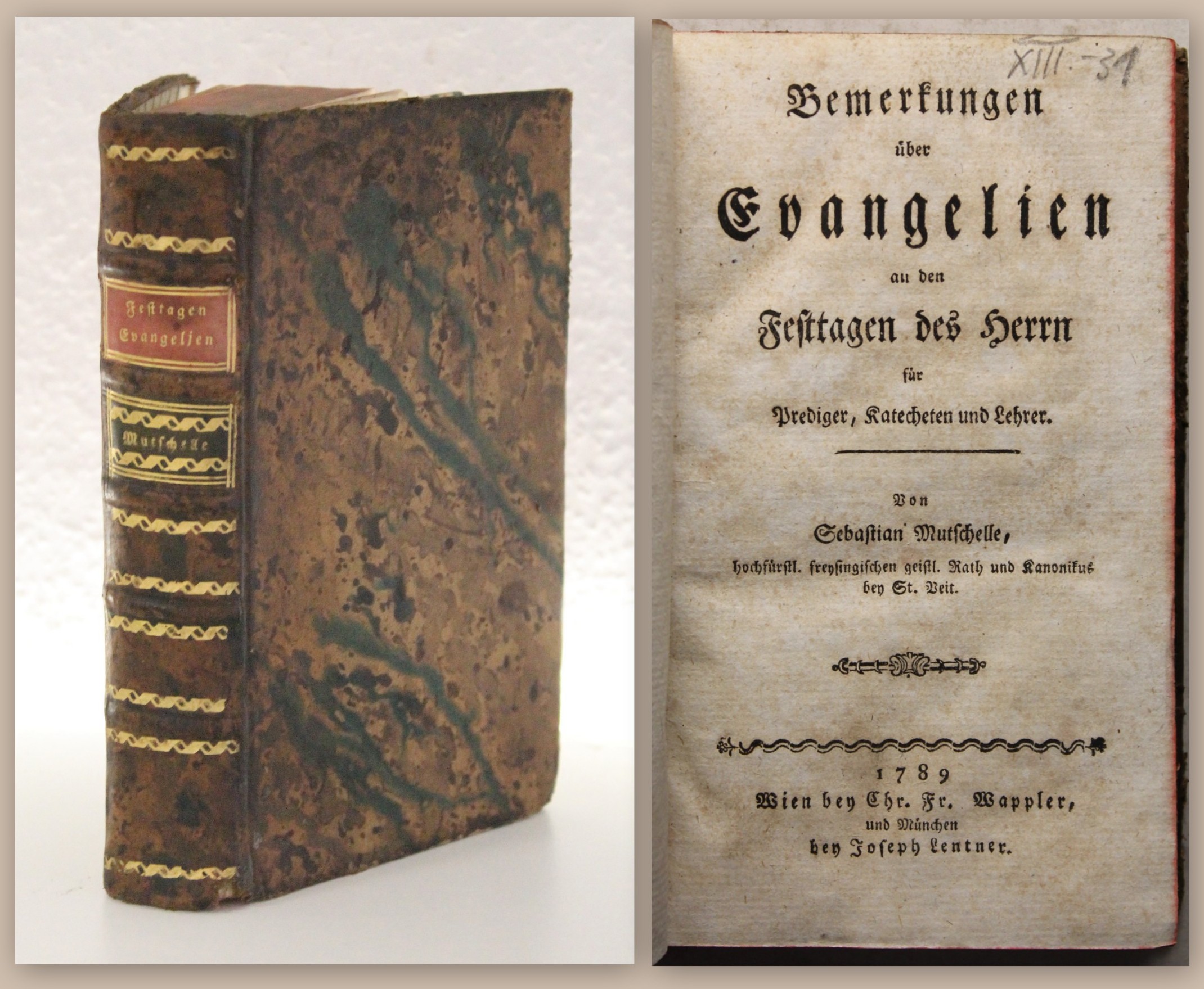 Mutschelle, Sebastian. Bemerkungen über Evangelien an den Festtagen des Herrn für Prediger, Katecheten und Lehrer. München und Wien, Josef Lentner / Chr. Fr. Wappler, 1789. 8°, 1(w) Bl., 2 Bll., 430 S., 2 Bll.(le. w.), geprenkelter Ldr. d. Zt. mit 2 RS. Erste Ausgabe. Einband etwas berieben, kaum bestoßen, unteres Kapital mit winziger Fehlstelle. Papier vereinzelt braunfleckig. Wohl erhaltener, hübscher Band. Bestell-Nr: 3-0-42..........verkauft | ![]() | |