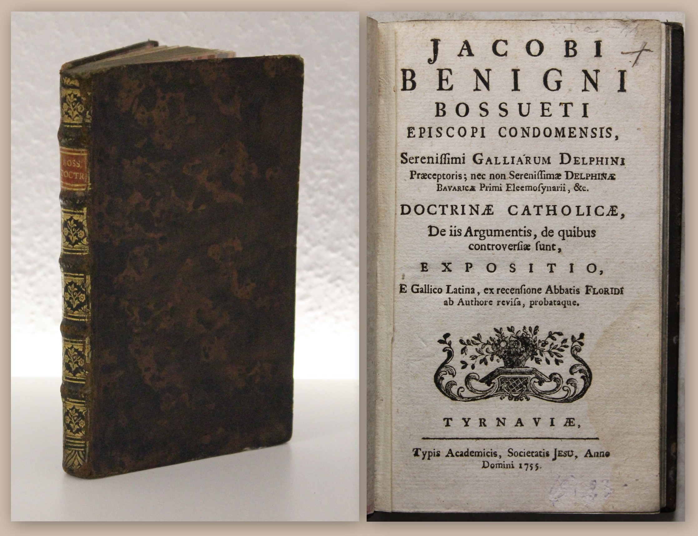 Bossuet, Jacques Benigne. Jacobi Benigni Bossueti Episcopi Condomensis, [...] Doctrinae Catholicae, De iis Argumentis, de quibus controversiae sunt, Expositio, E Gallico Latina, ex recesione Abbatis Floridi ab Authore revisa, probataque. Tyrnaviae, Academicis Societatis Jesu, 1755. 8°, 8 Bll., 112 S., 2 Bll., Ldr. d. Zt. mit reichhaltig goldgepr. Rücken. Einband etwas berieben und bestossen. Oberes Kapital abgegriffen, hinterer Deckel mit 3 kleinen Wurmgängen. Papier altersbedingt leicht gebräunt, erste Blatt mit schwächer werdendem Feuchtogkeitsrand. Erstes weißes Blatt fehlend. Gutes Exemplar. Bestell-Nr: 3-0-43..........130,00 € (inkl. MwSt. zzgl. Versand) | ![]() | |