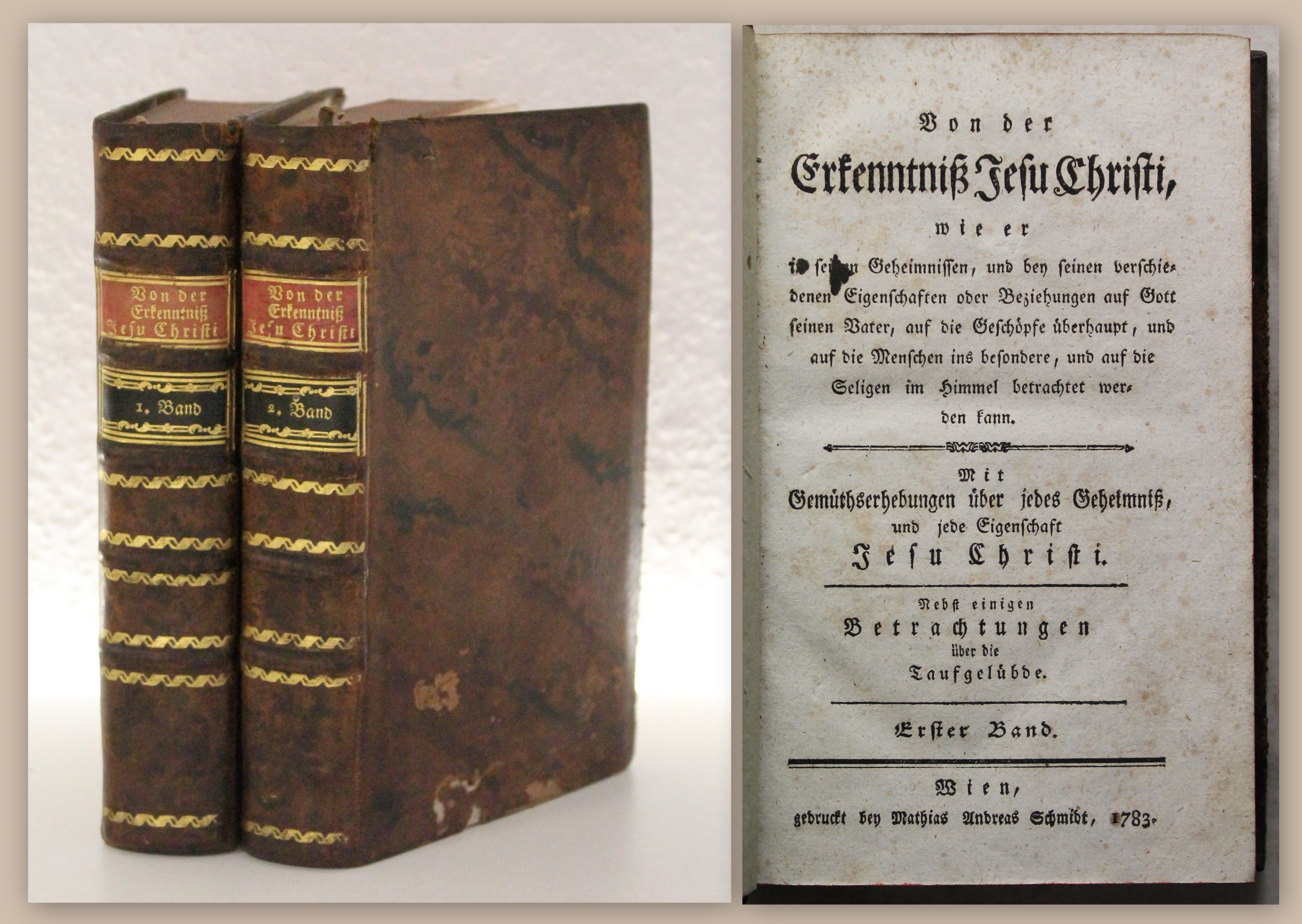 Anonym [Croz, Peter]. Von der Erkenntniß Jesu Christi : wie er in seinen Geheimnissen, und bei seinen verschiedenen Eigenschaften oder Beziehungen auf Gott seinen Vater, auf die Geschöpfe überhaupt, und auf die Menschen ins besondere, und auf die Seligen im Himmel betrachtet werden kann ; Mit Gemütserhebungen über jedes Geheimniß und jede Eigenschaft Jesu Christi ; Nebst einigen Betrachtungen über die Taufgelübde. 2 Tle. in 2 Bd. (alles). Wien, Mathias Andreas Schmidt, 1783. 8°, 589 S.; 534 S., 1 Bl., Ldr. d. Zt. mit je 2 RS. Einbände mit geringen Gebrauchsspuren. Bd. 1 am oberen Kapital mit winzier Fehlstelle, Deckel mit oberflächigen Schab- und wurmspuren. Papier sauber, Titel von Bd. 1 mit kleinem Tintenfleck, Vorderer Spiegel von Bd. 1 mit altem hs. Eintrag. Gute, dekorative Exemplare. Bestell-Nr: 3-0-44..........verkauft | ![]() | |