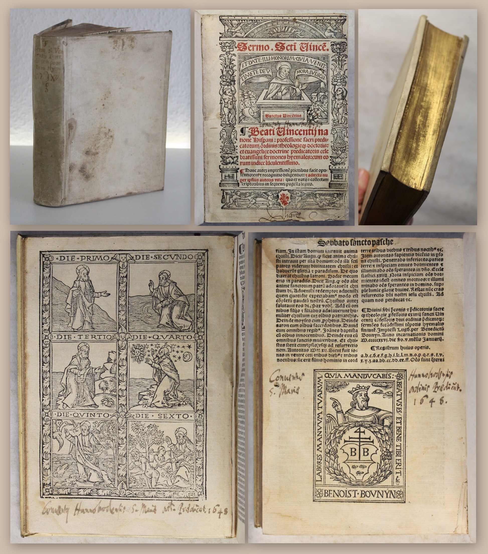 Ferrier, Vincent (Vinzenz Ferrer). Sermo. Scti. Vince. Beati Vincentij natione hispani: professione sacri predicatorum ordinis: theologieque doctoris: et euangelice doctrine predicatoris celebratissimi sermones hyemales: cum eorum indice luculentissimo. Hanc autem impressionem prioribus facit opulentiorem et recognitio diligentior: et adiecta nuper ipsius autoris vita [...] . Lyon, Benoist Bounyn (Drucker), 1526. 8°, mit 1 ganzseitigem Holzschnitt, Titelholzschnitt und umlaufender figürlicher Bordüre, zahlreichen floral verzierten Holzschnittinitialen sowie Holschnittdruckermarke auf dem letzen Blatt, 12 Bll., 231 Bll., Pgmt. d. Zt. mit Rundumgoldschnitt. Biblioteca Palatina - PR0072 PARPA - Der schöne ganzseitige Holzschnitt zeigt die 6 Tage der Erschaffung der Welt durch Gott. Einband etwas berieben, gering bestoßen, etwas angeschmutz und fleckig. Kopfgoldschnitt mit Feuchtigkeitsfleck. Der zweifarbige Titel mit alten hs. Besitzeintragungen, zwei kleinen Löchlein, sowie mit verso hinterlegtem Einriss. Die ersten 6 Seiten mit einem kleinem alt hinterlegtem Löchlein dadurch etwas Buchstabenverlust. Zu Beginn und Ende im Rand feuchtigkeitsrandig. letzte Seiten Blatt CCXXIII-CCXXVII im oberen Rand mit alt gelöster Seitenverklebung, dadurch 2 Seiten mit leichtem Textverlust und eine Blatt etwas ausgefranst, ebenso das hintere Vorsatzblatt mit kleiner Papierfehlstelle oben. Die letzten Blatt mit winzigem Wurmloch ohne Buchstabenverlust. Einige Seiten mit alten hs. Randanstreichungen und Notizen, der ganzseitige Holzschnitt mit hs. Bildunterschrift. Insgesamt noch gutes Exemplar diese nicht häufigen Lyoner Postinkunabelausgabe. Bestell-Nr: 3-0-45..........verkauft | ![]() | |