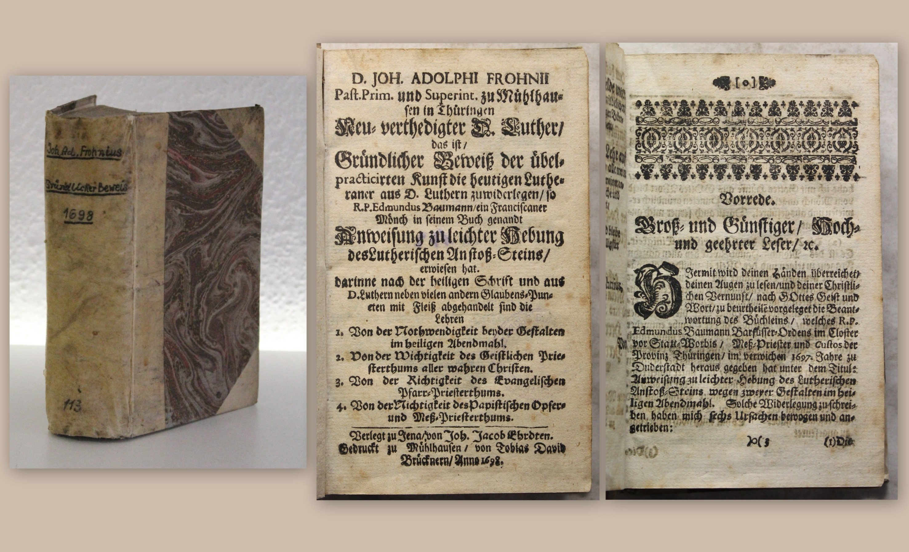 Frohne, Johann Adolph. D. Joh. Adolphi Frohnii [...] Neu- verthedigter D. Luther/ das ist/ Gründlicher Beweiß der übelpracticirten Kunst die heutigen Lutheraner aus D. Luthern zuwiderlegen/ so R. P. Edmundus Baumann/ ein Franciscaner Mönch in seinem Buch genandt Anweisung zu leichter Hebung des Lutherischen Anstoß-Steins/ erwiesen hat : darinne ... abgehandelt sind die Lehren 1. Von der Nothwendigkeit beyder Gestalten im heiligen Abendmahl. 2. Von der Wichtigkeit des Geistlichen Priesterthums aller wahren Christen. 3. Von der Richtigkeit des Evangelischen Pfarr-Priesterthums. 4. Von der Nichtigkeit des Papistischen Opfer- und Meß-Priesterthums . Jena, Ehrt, Johann Jakob / Brückner, Tobias David (Drucker), 1698. 8°, 8 Bll., 586 S., 3 Bll.(Register), spät. HPgmt. Einband berieben, bestoßen und angeschmutzt. Rücken mit neuerem hs. Titel. Vorderer Vorsatz erneuert, SPiegel, Vorsatz, Titel verso mit alten Bibliotheksstempeln und Besitzvermerken. Gutes Exemplar des seltenen Titels. Bestell-Nr: 3-0-46..........650,00 € (inkl. MwSt. zzgl. Versand) | ![]() | |