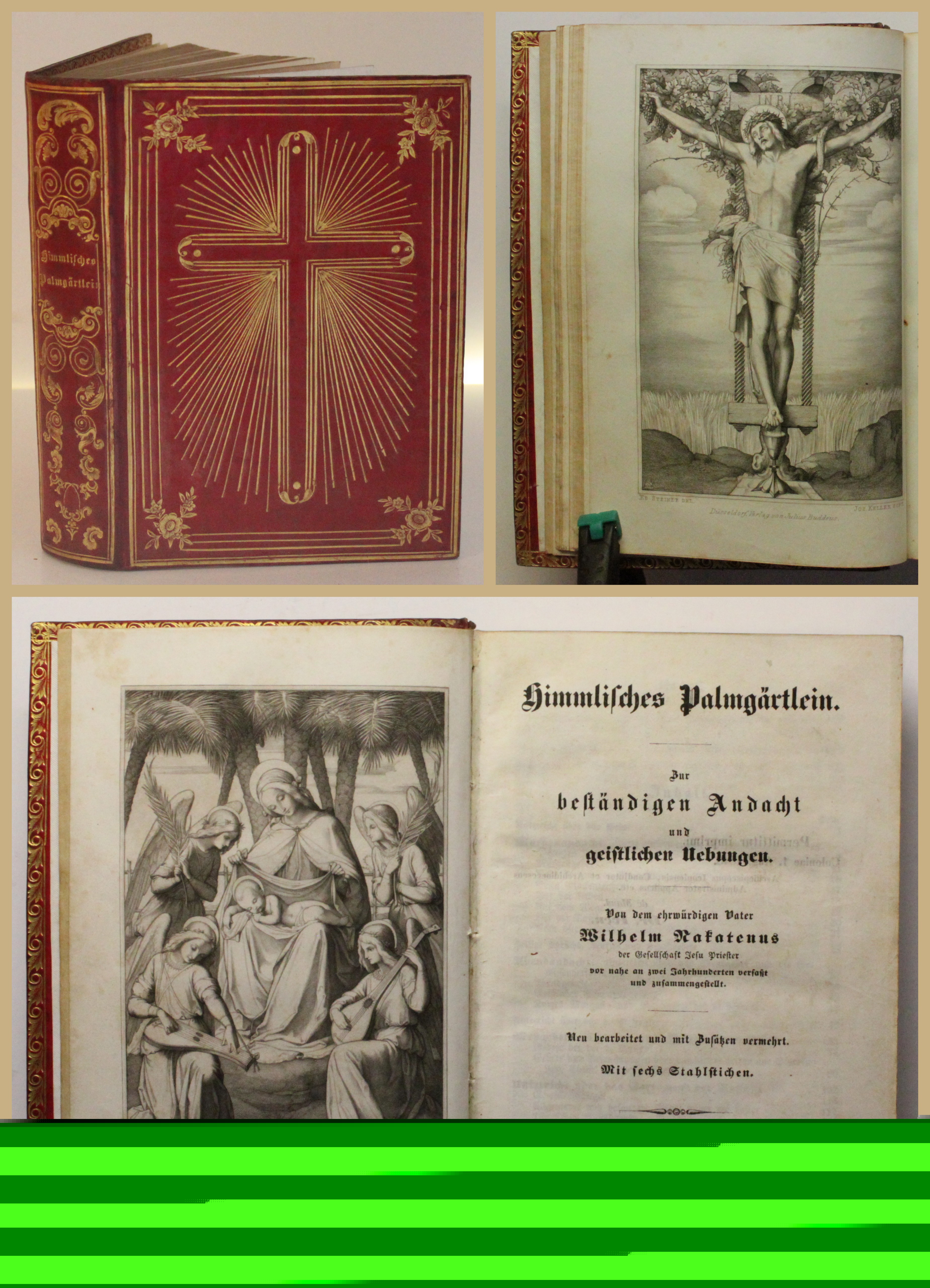 Nakatenus, Wilhelm. Himmlisches Palmgärtlein. Zur beständigen Andacht und geistlichen Uebungen. Mit 6 Stahlstichtafeln. Neu bearbeitet und mit Zusätzen vermehrt. Düsseldorf, Julius Buddens, 1843. 8°, mit 6 Stahlstichen, 716 S., Rotes Ldr. d. Zt. mit dreis. Goldschnitt u. reicher Goldprägung, goldgepr. DFileten, Eckfleurons, Steh- u. Innenkantenvergoldung. Der herrliche Einband mit sehr geringen Gebrauchsspuren. Papier gering gebräunt, sehr vereinzelt minimal braunfleckig. Bestell-Nr: 3-0-58..........180,00 € (inkl. MwSt. zzgl. Versand) | ![]() | |