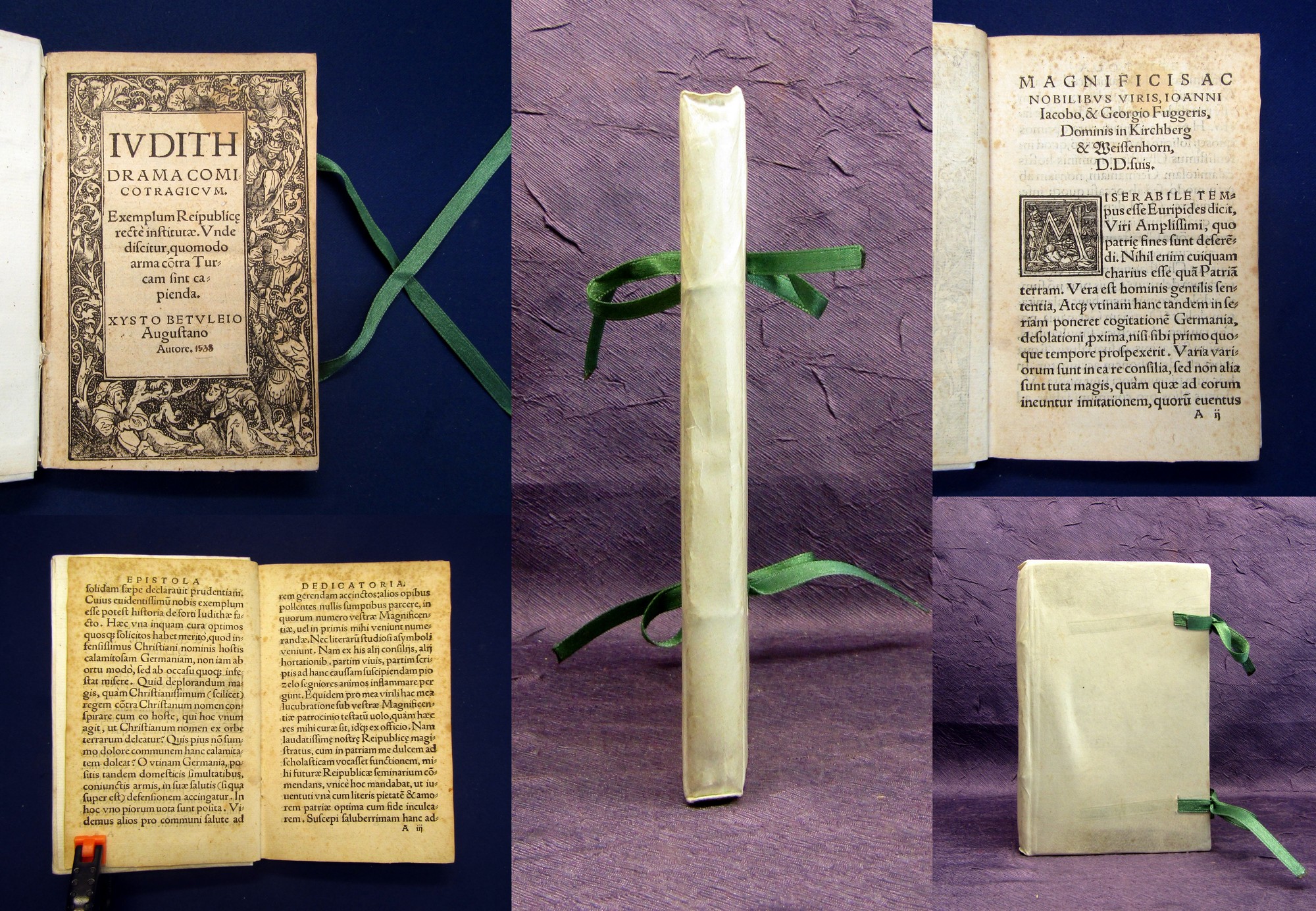 Betuleio, Xysto [d.i. Birck, Sixtus]. Iudith Drama Comicotragicum. Exemplum Reipublic[a]e recte institutae. Unde discitur, quomodo arma co[n]tra Turcam sint capienda. Augsburg, Philipp Ulhart, o.J. (1539). kl. 8°, mit figürlicher Holzschnitttitelbordüre, großer Holzschnittdruckermarke und 2 Holzschnittinitialen, 80 nn. Bll. (le. weiß), neuerer Pgmt. mit Bindebändern i. Stil d. Zt. VD16:B5570; Graesse 1, 355 - Erste lateinische Ausgabe. Graesse weist der "Judith", ohne Angabe der Sprachvariante, das Erscheinungsjahr 1539 aus. Der "General Catalogue of Printed Books" des British Museum, Bd. 19, Sp. 615, weist die vorliegende, lateinische Ausgabe ebenso mit 1539 zu. Die erste lateinische Ausgabe, welche unüblicherweise wohl nach der ersten deutschen Ausgabe erschien, unterscheidet sich von der deutschen Ausgabe im Wesentlichen durch die klare Strukturierung in 5 Akte sowie die ausgiebige Vorrede an Johann Jakob und Georg Fugger. Titel mit hs. Eintrag einer Jahreszahl (1538). Papier altersbedingt etwas gebräunt und braunfleckig, die ersten Bll. mit schmalem, leichten Feuchtigkeitsrand oben. Die letzten Bll. mit dünner Wurmspur im äußeren weissen Rand. Gutes Exemplar des seltenen Titels. Bestell-Nr: 3-0-6..........verkauft | ![]() | |
