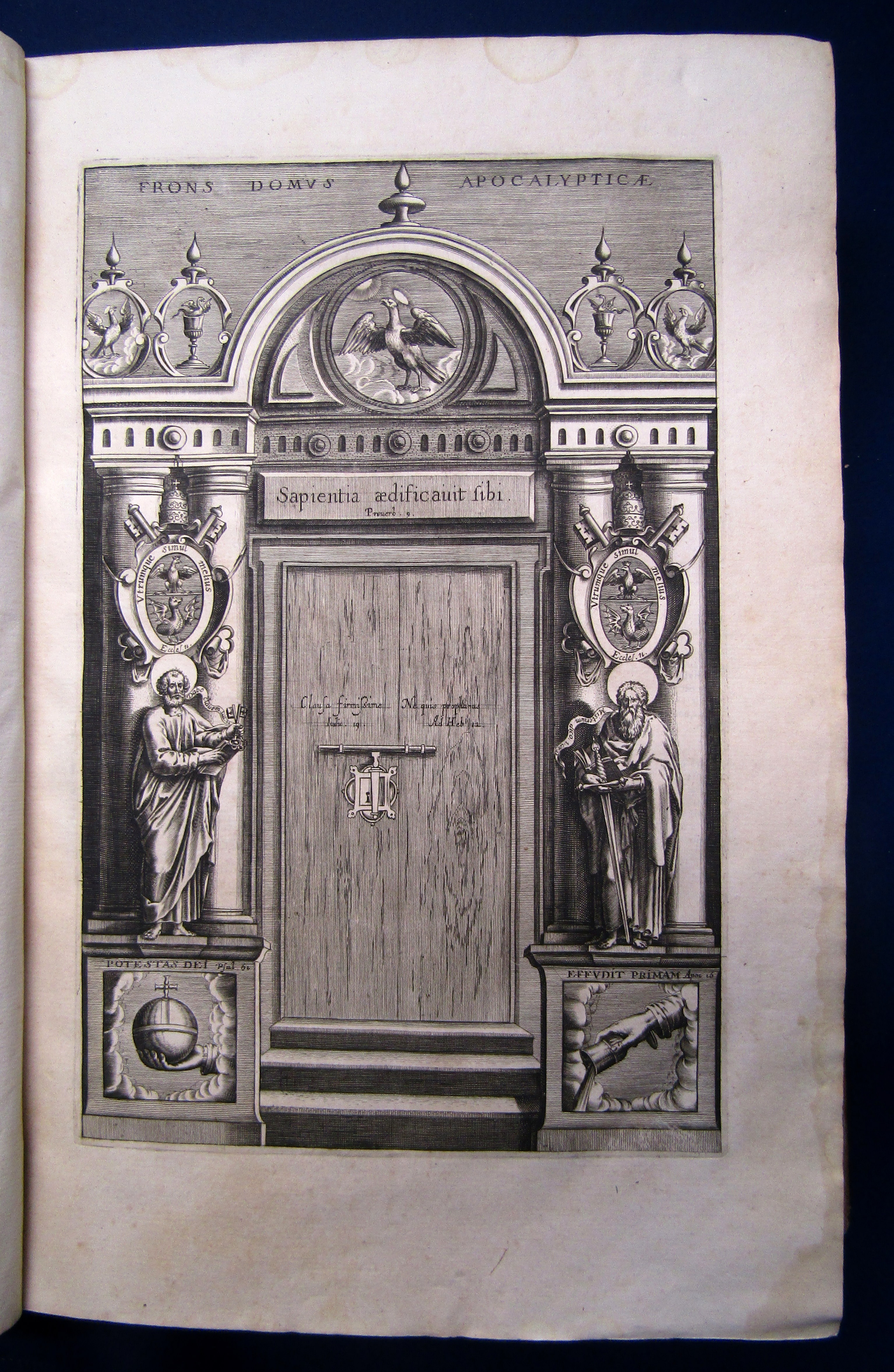 Alcasar, Ludovici [Luis]. [Vestigatio arcani sensus in Apocalypsi] Rev. patris Lvdovici Ab Alcasar Hispalensis E Societate Iesv Theologi [...] Vestigatio Arcani Sensvs In Apocalypsi. Adiectum quoque Opusculum de sacris ponderibus et mensuris. Lugduni, Antonij Pillehotte, 1618. Folio, mit gest. Titelvignette und 25 Abbildungen auf 9 (6 ganzseitigen) Kupfern, XXI S., [1] Bl., 778 S., [36] Bl., 74 S., Pgmt. d. Zt. Zweite Ausgabe von Alcasars "Apocalypticon". Alcasar widmete sein ganzes Leben der Erarbeitung einer Neuinterpretation der Offenbarung des Johannes. Die "Vestigatio arcani sensus in Apocalypsi" wurden ein Jahr nach seinem Tode 1614 erstmals publiziert und stellen die älteste bekannte Neuinterpretation der Apocalypse dar. Die Illustrationen wurden neu gestochen, getreu den Kupfern der Antwerpener Erstausgabe von 1614, welche Don Juan Jaureguy (1583 - 1641), ein spanischer Maler und Poet besorgte. Einband etwas berieben und bestoßen sowie etwas angeschmutzt. Deckel leicht aufgebogen. Rücken oben und unten etwas wurmspurig dadurch die Gelenke eingerissen. Papier gebräunt, teils etwas braunfleckig. Titel oben mit kleinem hinterlegten Loch ohne Textberührung. Die schönen Stiche in starkem Abdruck. Gutes Exemplar. Second edition of Alcasar's "Apocalypticon". Alcasar devoted his entire life to working out a reinterpretation of the Revelation of John. The "Vestigatio arcani sensus in Apocalypsi" were first published a year after his death in 1614 and represents the oldest known reinterpretation of the Apocalypse. The illustrations were repainted, true to the copper of the Antwerp first edition of 1614, which Don Juan Jaureguy (1583-1641 ), a Spanish painter and poet. - Paper browned, partly brownstained. Title above with a small deposited hole without text touch, pages partly waterstained, 1 illustr. within a plate rubbed. Nice copper plates. - Overall good copy. . Bestell-Nr: 3-0-62..........4.500,00 € (inkl. MwSt. zzgl. Versand) | ![]() | |