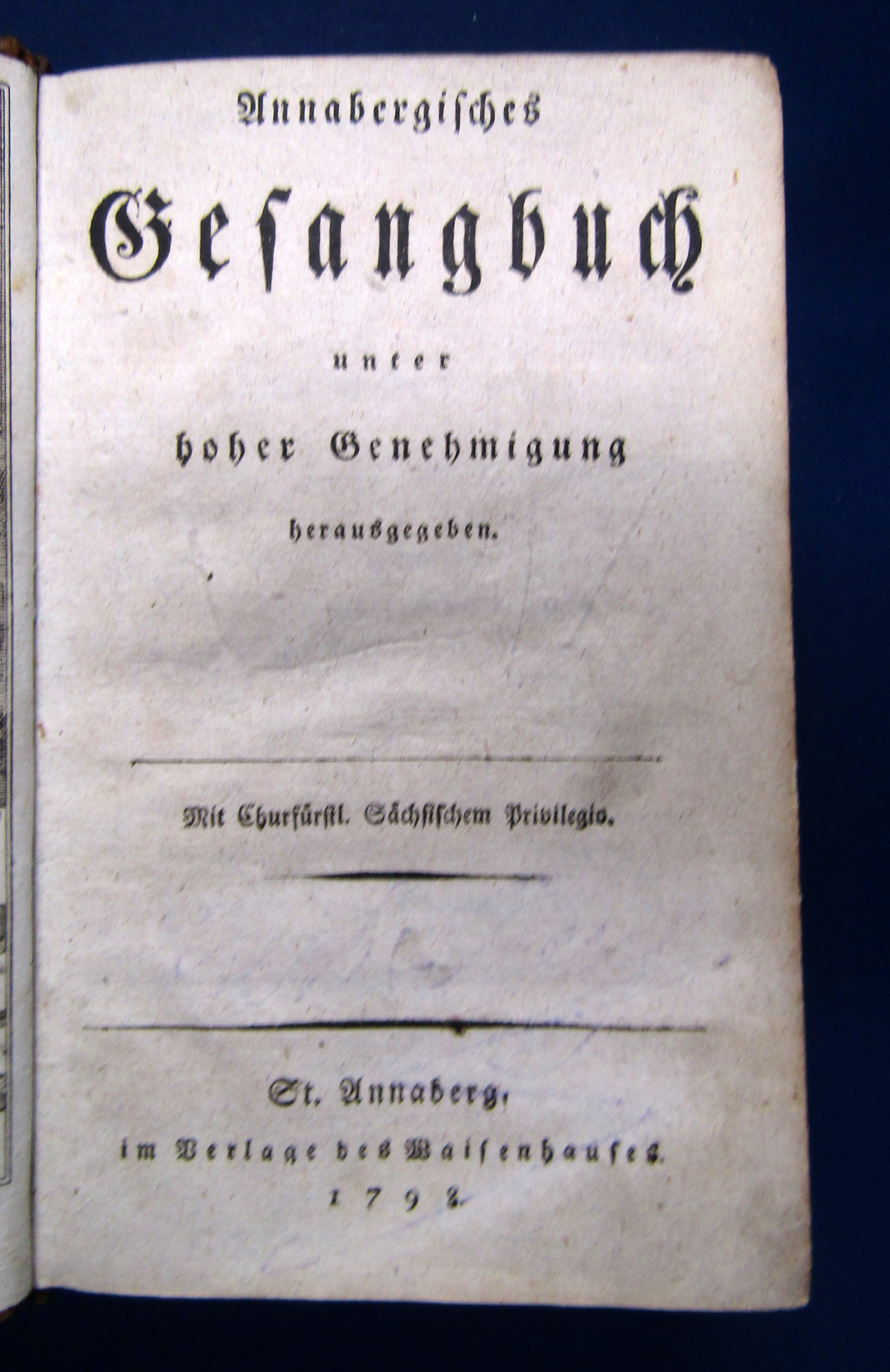 ohne. Annabergisches Gesangbuch unter hoher Genehmigung herausgegeben. St. Annaberg, Verlag des Waisenhauses, 1798. 8°; mit gest. Frontispiz (Kircheninneres & Ansicht v. Annaberg); XXII; 592 S.; 80 S.; Leder. Einband leicht berieben und bestoßen. Papierbedingt leicht gebräunt. Gutes Exemplar.. Bestell-Nr: 3-0-85..........verkauft | ![]() | |