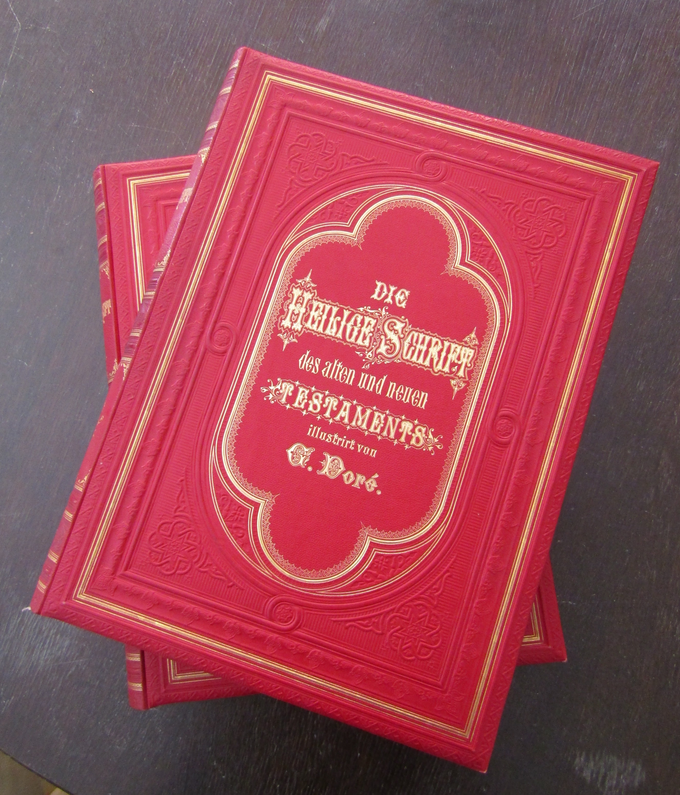 . Dore - Bibel. Die heilige Schrift. Alten und Neuen testaments verdeutscht von D. Martin Luther. Prachtausgabe. 2 Bde. Stuttgart, Deutsche Verlagsanstalt, um 1885. Fol.; Prachtausgabe mit 230 Bildern von Gustav Dore; 9 Bll.; 774 Sp.; 6 Bll.; Sp. 775-1236; 344 Sp.; dekor. gold- u. blindgepr. rote OHLdrbde mit dreis. Goldschnitt in OPp.-Kasetten. Paul Gustave Doré war ein französischer Maler und Grafiker, der sich vor allem als Illustrator einen Namen machte. - OPp-Kassetten mit starken Gebrauchsspuren. Herrliche, nahezu unberührte, verlagsfrische Exemplare.. Bestell-Nr: 3-0-89..........verkauft | ![]() | |