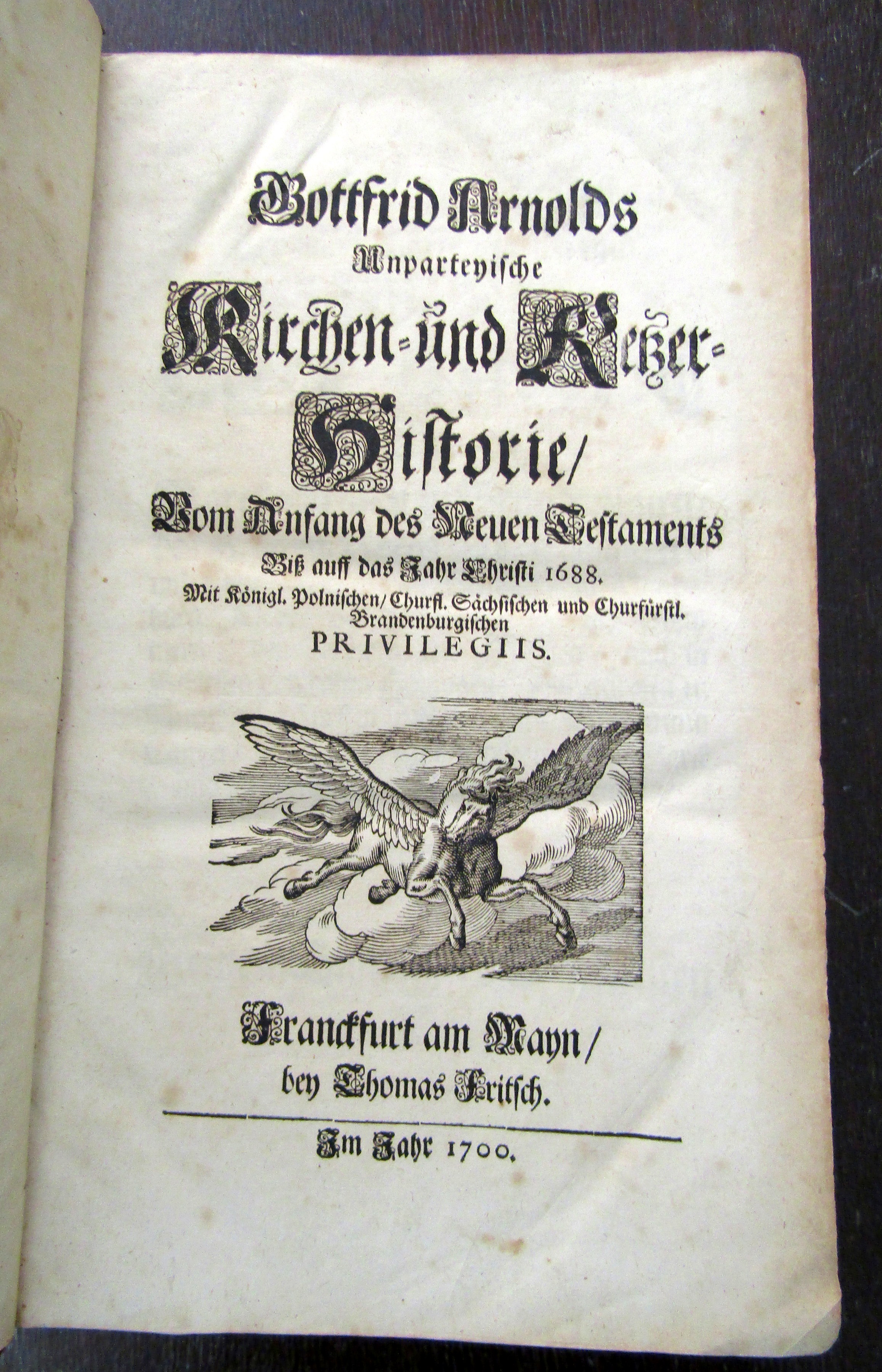 Arnold, Gottfried. Unparteyische Kirchen- und Ketzer-Historie, von Anfang des Neuen Testaments biß auf das Jahr Christi 1688... Und Fortsetzung und Erläuterung oder 3. u. 4. Theil... nebst den Supplementis und Emendationibus. 4 Tle in 2 Bde. Frankfurt, Thomas Fritsch, 1700 u. 1715. Fol.; 9 Bll., 1202 S., 18; 4 Bll., 1488 S., 8 Bll.; Ldrbde d. Zt.. Vgl. Dünnhaupt I.327.17.5 - Faber du Faur 1452 (nur Teile 1-2) - Jantz 399 - "Ein unvergängliches Denkmal des glückl. Fleisses und duldsamer, kräftiger Unbefangenheit" (Goedeke). Obschon von Christian Thomasius als nützlichstes Buch seit der Bibel bezeichnet, weigerte sich selbst ein Mann wie Spener, es auch nur aufzuschlagen ... Dennoch bleibt das Werk bis heute eine wertvolle Informationsquelle zu zahlreichen Persönlichkeiten, über die sonst kaum Nachrichten auffindbar sind." (Dünnhaupt). - Einbände berieben, bestoßen und leicht fleckig. Vorsatz bei Theil 1 u. 2 mit schönem Wappebexlibris. Papier altersbedingt etwas gebräunt. Gute Exemplare.. Bestell-Nr: 3-0-90..........verkauft | ![]() | |