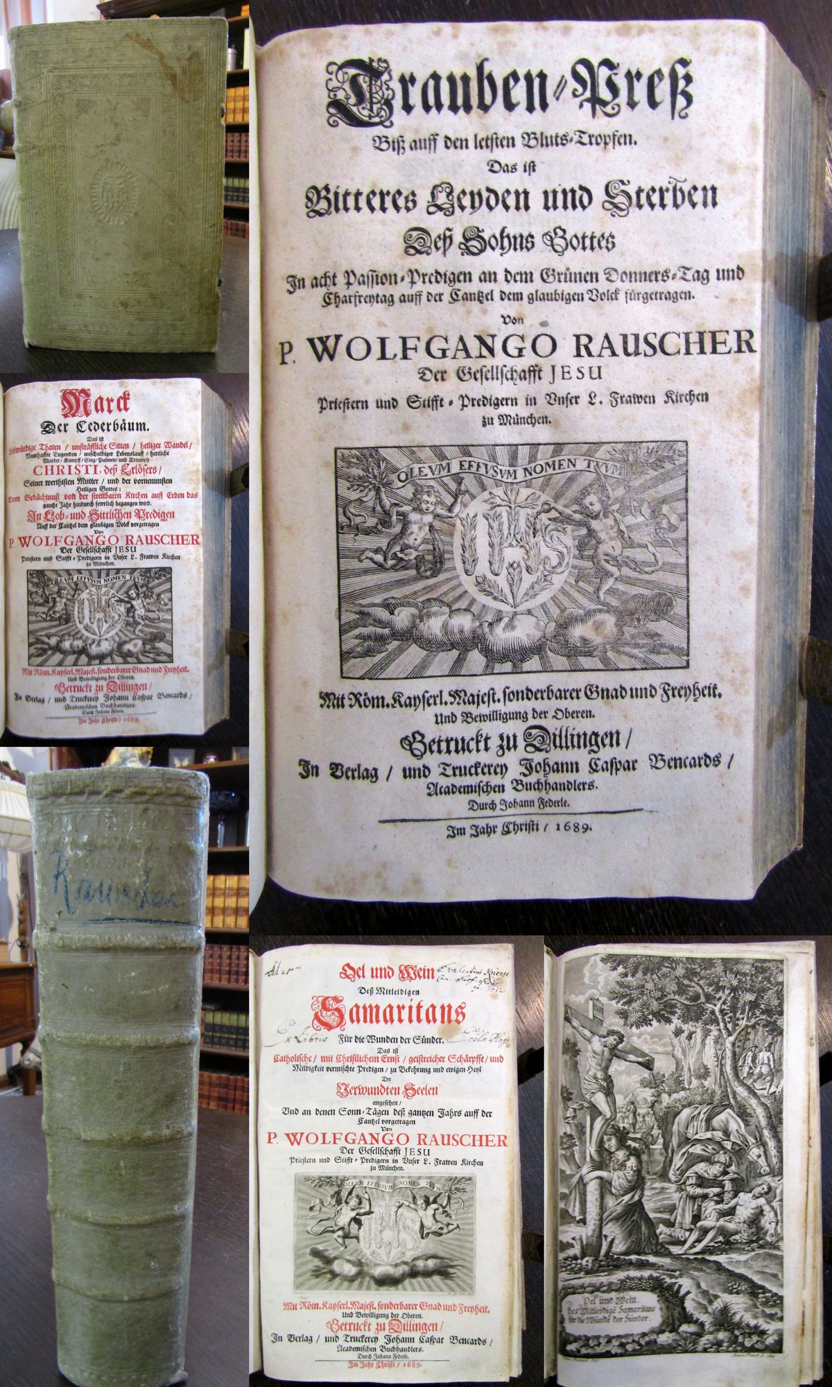 Rauscher, Wolfgang. Oel und Wein deß Mitleidigen Samaritans für die Wunden der Sünder. [...], angeb. ders.: Trauben-Preß biß auff den letsten Bluts-Tropfen. Das ist Bitteres Leyden und Sterben deß Sohns Gottes [...]. angeb. ders.: Marck der Cederbaum. Das ist lobwürdige Thaten, unsträffliche Sitten ... und Triumph Christi, Dess Erlösers, Seiner werthisten Mutter, und der vornemmsten Heiligen Gottes [...]. Dillingen, Johann Caspar Bencard, 1689. Folio, mit gest Titel, gest. Titelvignette und 2 Holzschnitttitelvignetten, 1(w), 6 Bll., 410 S., 9 Bll.; 88 S., 2 Bll.; 8 Bll., 539(1) S., 19 Bll., 1(w), blindgepr. Schweinsledereinband mit 2 Schließen. VD 17, 12:632942D und 12:632946K. De Backer-Sommervogel VI, 1494, 3 - Erster Druck dieser Schrift des Mühldorfer Jesuitenpaters und Stiftspredigers der Münchener Frauenkirche Wolfgang Rauscher (1641-1709). Der schöne Titelkupfer zeigt Jesus Amabilis und den Ordensgründer Ignatius von Loyola. - Einband etwas berieben und leicht fleckig. Papier etwas gebräunt, Vorsatz mit altem hs. Eintrag. Titel mit 2 hs. Besitzeinträgen. Gutes Exemplar mit 3 Titeln in erster Ausgabe. Bestell-Nr: 3-0-93..........750,00 € (inkl. MwSt. zzgl. Versand) | ![]() | |
