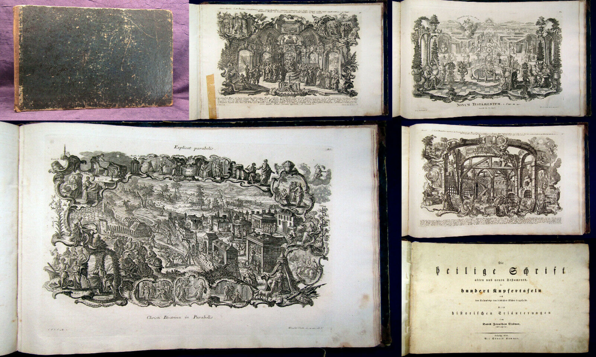 Lindner, David Jonathan. Die heilige Schrift alten und neuen Testaments, in hundert Kupfertafeln nach der Reihenfolge der biblischen Bücher dargestellt. Nebst historischen Erläuterungen. Leipzig, Kummer, 1836. quer 4°, mit 100 ganzseitigen Kupfertafeln, IV, 25 S., HLn. d. Zt. Seltene Kupferstichsammlung mit großformatigen Bildern zur Bibel. - Einband mit stärkeren Gebrauchsspuren, berieben, bestoßen, Gelenke rissig, Bindung in den Innengelenken gelockert. Papier etwas gebräunt, vereinzelt etwas finger-/braunleckig, zumeist jedoch sauber, nur im weissen Rand teils mit kleineren Läsuren. Bestell-Nr: 3-0-96..........verkauft | ![]() | |