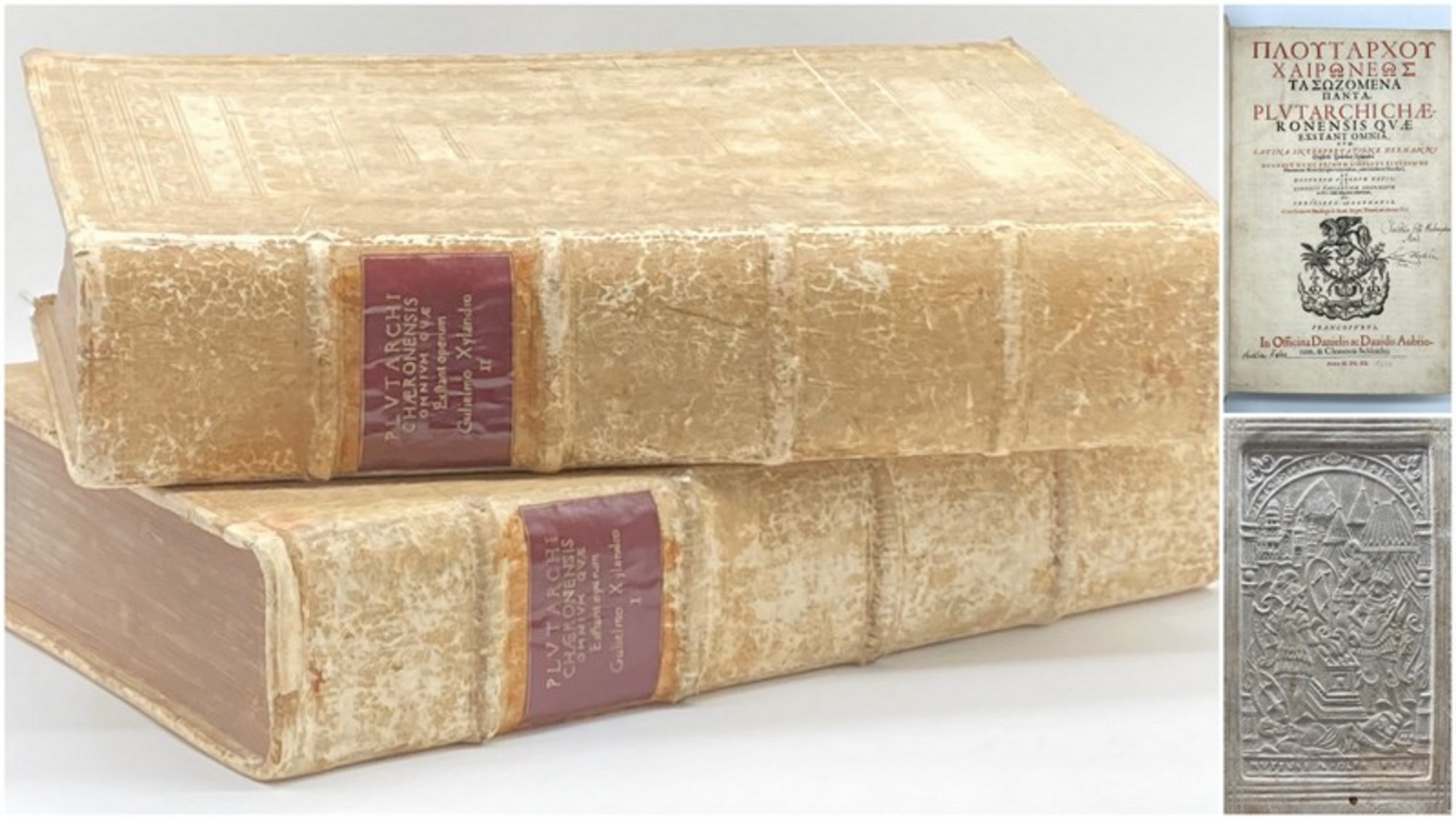 Plutarch / Xylander, Wilhelm / Cruser, Hermann (Übs.). Plutarchi Chaeronensis quae extant omnia, cum Latina interpretatione Hermanni Cruserii: Guilielmi Xylandri [...] 2 Bde. (alles). Frankfurt, Aubrior & Schleich, 1620. Folio (40 x 25 cm), 22 nn. Bll., 1076 S., 114 S., 16 nn. Bll; 4nn. Bll., 1164 S., 80 S., 18 nn. Bll(le. w.), reichhaltig blindgepr. Schweinsledereinbände mit figürlichen Mittelstücken und RS. Schöne, umfangreiche Ausgabe der Werke Plutarchs in der wichtigen Bearbeitung von Xylander und Cruser mit griechisch/lateinischem Paralleltext. Die EA erschien bereits in den 1560-er Jahren. - Die dekorativen Einbände mit normalen Gebrauchsspuren, etwas berieben und bestoßen, Band 1 rückseitig mit kleiner Schabstelle. Einbände reichlich blindgeprägt, mit 5 Bordüren (figürlich und floral) sowie je 2 unterschiedlichen, figürlichen Mittelstücken "Ritterkapf vor einer Burg" und "Kriegsrat vom König mit Rittern vor der Stadt". Rückenschilder im alten Stil erneuert. Papier gering gebräunt, Vordere Spiegel mit je 3 alten Exlibris, 2 davon von den schwedischen Gelehrten "Ant[on]Flentsberg" und "rudolf Annerstwedt". Das dritte Exlisbris von "Brunonis Bassi". Vorderer Spiegel und Titel je mit alten hs. Namenszügen. Sehr schöne Exemplare des wichtigen Werkes. Bestell-Nr: 3-0-99..........verkauft | ![]() | |