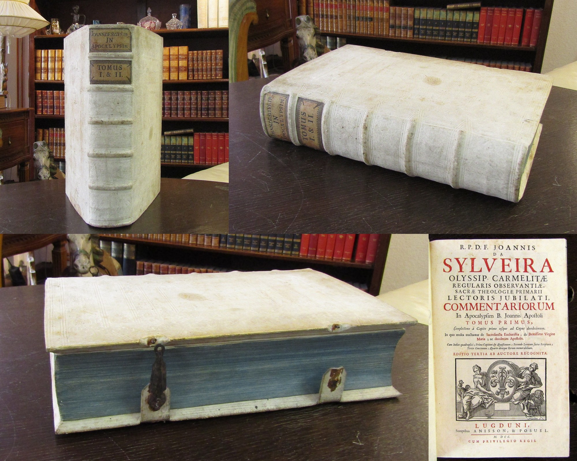 Sylveira, Johannes da. Commentariorum in Apocalypsim B. Joannis Apostoli. 2 Bde. in 1. Lugduni, Anisson & Posuel, 1700. 2°(37x25cm), 2 Holzschnitt-Titelvignetten, 44 Bll., 602 S., 57 Bll., 608 S., 20 Bll., blindgeprägter Wolleinband mit 2 Rückenschildern und Messingschließen. Nachdem Sylveira seine wissenschaftlichen Studien im Kollegium in Coimbra vollendet, wurde er viele Jahre hindurch als Lehrer der Philosophie und Theologie in Ordensschulen verwendet. In letzterem Konvent wurde auf seine Veranlassung ein ihm von seiner Schwester zugewendetes Vermächtnis großenteils dazu verwandt, für die Klosterbibliothek zahlreiche wertvolle Werke anzuschaffen. - Einband berieben, bestoßen und stellenw. fleckig, 1 von 2 Schließen defekt, blauer Rundumschnitt, Papier altersbedingt gebräunt und leicht knickspurig. Bestell-Nr: 3-0-207..........550,00 € (inkl. MwSt. zzgl. Versand) | ![]() | |
