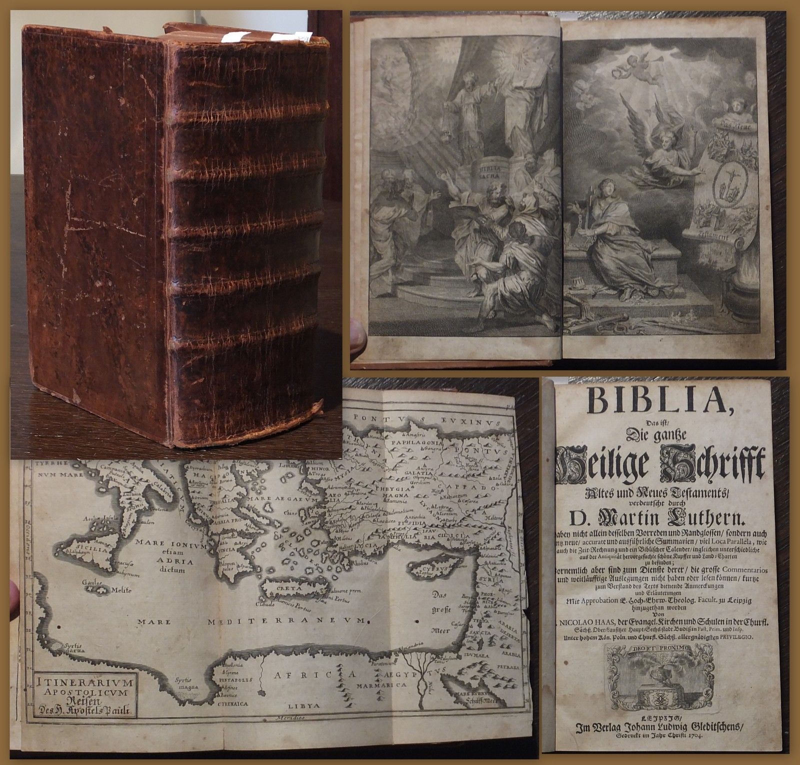Pfaffen, C. M.. Biblia germanica. - Biblia, Das ist: die gantze heilige Schrift Alten und Neuen Testaments, nach der Übersetzung und mit den Vorreden und Randglossen D. Martin Luthers.. Tübingen, Cotta, Pfaffen, 1729. gr. Folio(43x27cm), 2 Frontispizen, 2 gestochene Kopfvignetten, 1 gefalt, gest. Plan, 2 gest. Karten und 2 Kupfertafeln, 12 Bll.,1248 S., 5 Bll., 582 S., 80 S., 38 Bll., Ledereinband über Holzdeckeln. Einband berieben, bestoßen, Ecken stärker bestoßen, Rücken mir dekorativer Goldprägung, unterer Rücken restauriert, Papier minimalst gebräunt. Schönes Exemplar. Bestell-Nr: 3-0-163..........verkauft | ![]() | |