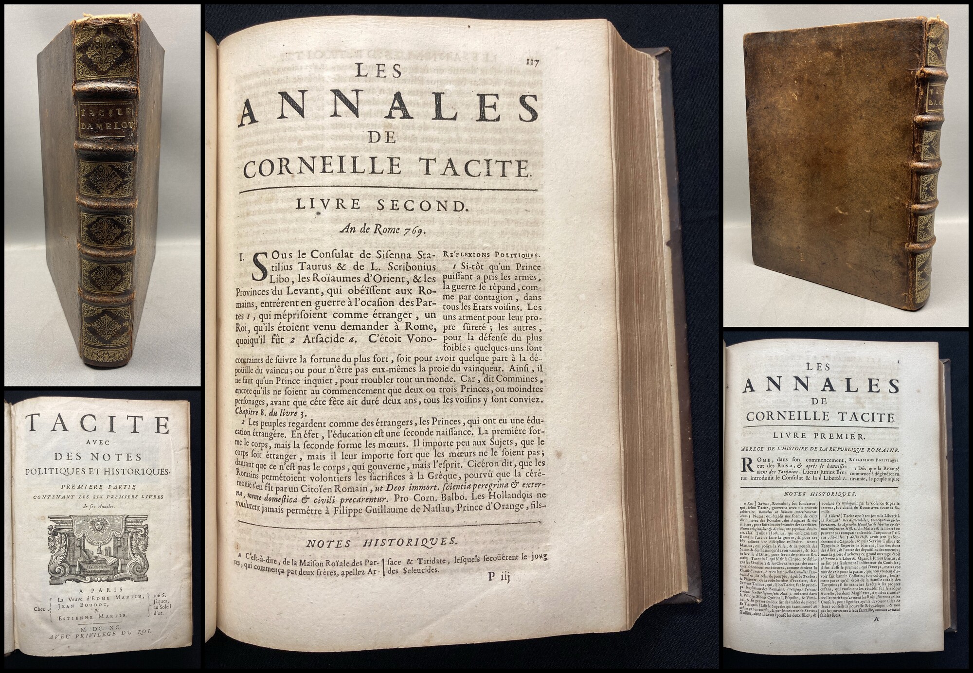 Tacite. Tacite avec Des Notes Politiques Et Historiques. Premiere Partie Contenant Les Six Premieres Livres de ses Annales. 1.Bd(von 2) mit den ersten 6 Teilen(von 12). Paris, Du Roi, 1690. 4°(25x17cm), xxij, (!), 503 S., Ledereinband der Zeit mit Goldprägung und 6 Bünden. Publius Cornelius Tacitus (* um 58, † um 120) war ein bedeutender römischer Geschichtsschreiber, Politiker und Senator. - Einband gering berieben und bestoßen, Papier gering gebräunt und hin und wieder fingerfleckig. Bestell-Nr: 4-0-366..........150,00 € (inkl. MwSt. zzgl. Versand) | ||