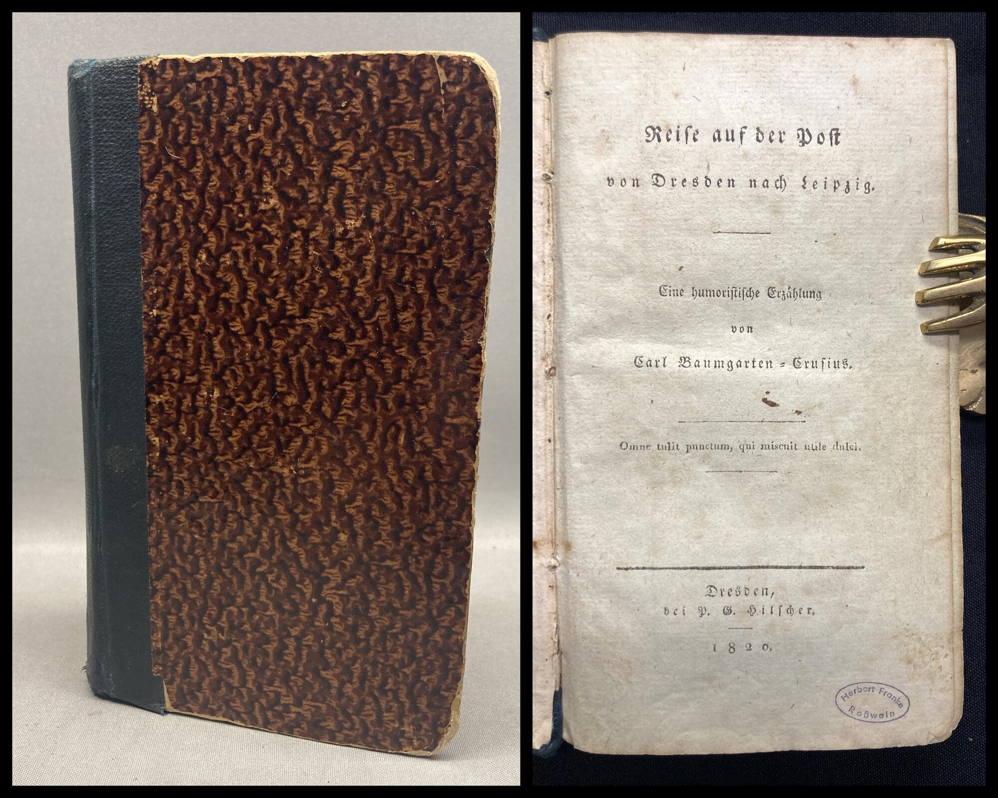 Baumgarten-Crusius, Carl Wilhelm. Reise auf der Post von Dresden nach Leipzig : eine humoristische Erzählung. Dresden, Hilscher, 1820. 8° (ca. 18 cm x 10,5 cm), 164 S., priv, Halbleinen um 1900. Sehr seltene, humoristische und landeskundlicher Erzählung der Reise mit der Postkutsche durch das Sachsenland. Einband bereiben und bestoßen, hinteres Außengelenk im unteren Bereich angeplatzt. Papier alterstypisch etwas gebräunt und fleckig.. Bestell-Nr: 4-0-369..........220,00 € (inkl. MwSt. zzgl. Versand) | ||