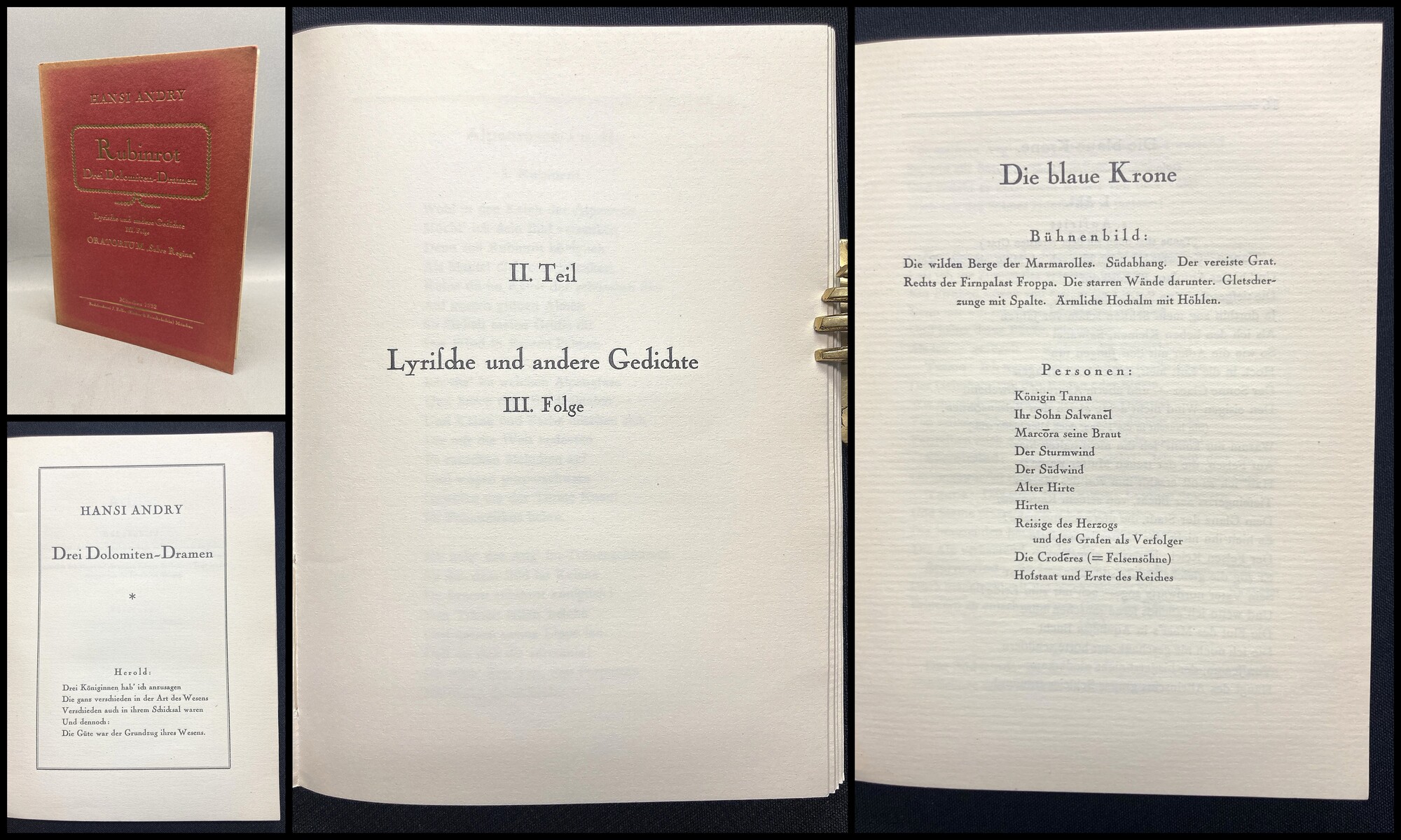 Anry, Hansi. Rubinrot - Drei Dolomiten Dramen - Lyrische und andere Gedichte III. Folge. München, Selbstverlag, (J.Fuller-Drucker), 1932. 8° (18x13 cm), 131(1) S., goldgepr. Ppbd. Einzige Ausgabe des seltenen Werkes. - Hansi Andry (geb. Schmid; geboren am 23. Juni 1864 in Imst in Tirol; gestorben am 24. Februar 1946 in München) war eine österreichische Dichterin und Epikerin. - Einband lichtrandig. Papier sauber, Bindung fest. Gutes Exemplar. Bestell-Nr: 4-0-372..........120,00 € (inkl. MwSt. zzgl. Versand) | ||