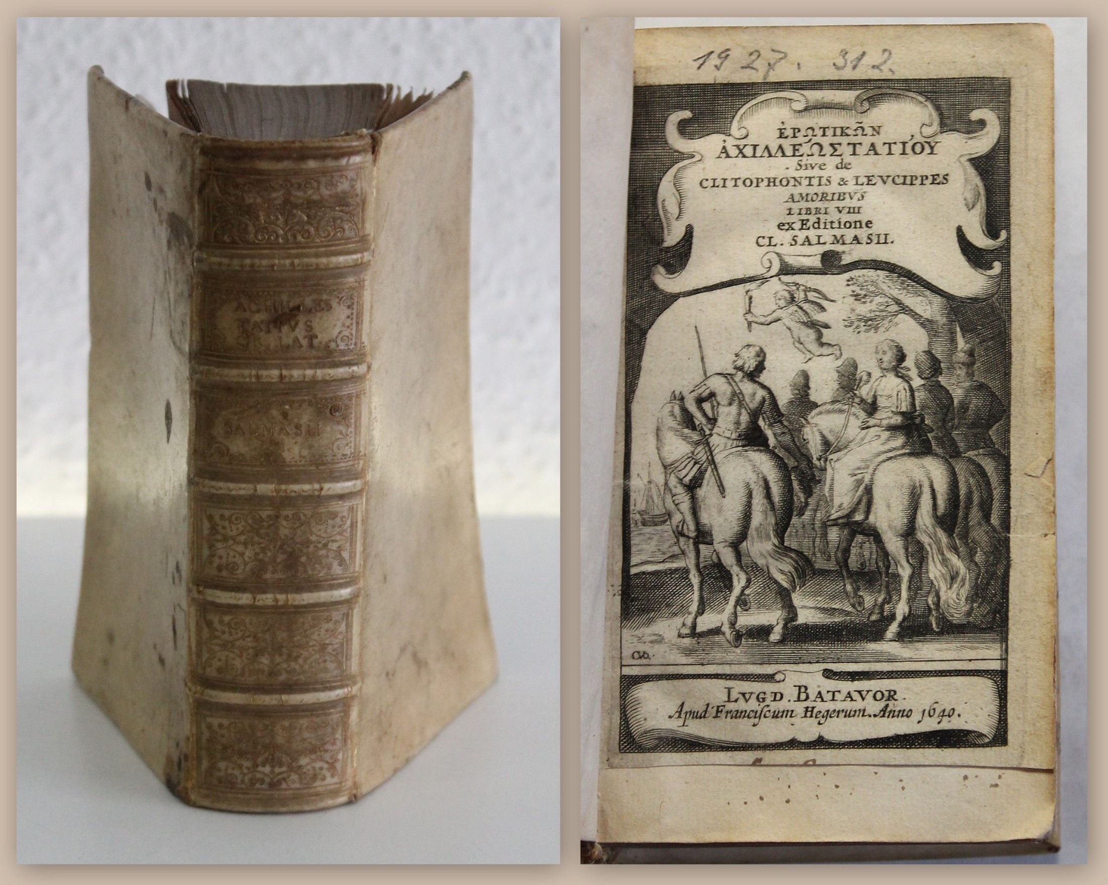 (Achilleus Tatios) / Saumaise, Claude (Hrsg.). Achillis Tatii Alexandrini Erotika Sive de Clitophontis & Leucippes amoribus Libri VIII ex Editione Cl. Salmasii. Leiden, Heger, 1640. kl. 8°, 3(w) Bll., gest. Titel., 11 nn. Bll., 752 S., 14 nn. Bll., 4(w) Bll., goldgepr. Prgt. d. Zt. Hoffmann I, 2; Gay I, 15; Hayn/G. VII, 600; Rahier 1187; Willems 1611 - Erste vollständige lateinische Ausgabe. Einband leicht berieben, etwas gebräunt und fleckig, Rundumgoldschnitt. Deckel leicht aufgebogen. Papier altersbedingt minimal gebräunt. Titel unten im weissen Rand beschnitten, seitlich mit kleinem Einriss. Sehr gutes Exemplar. Bestell-Nr: 6-0-11..........verkauft | ![]() | |