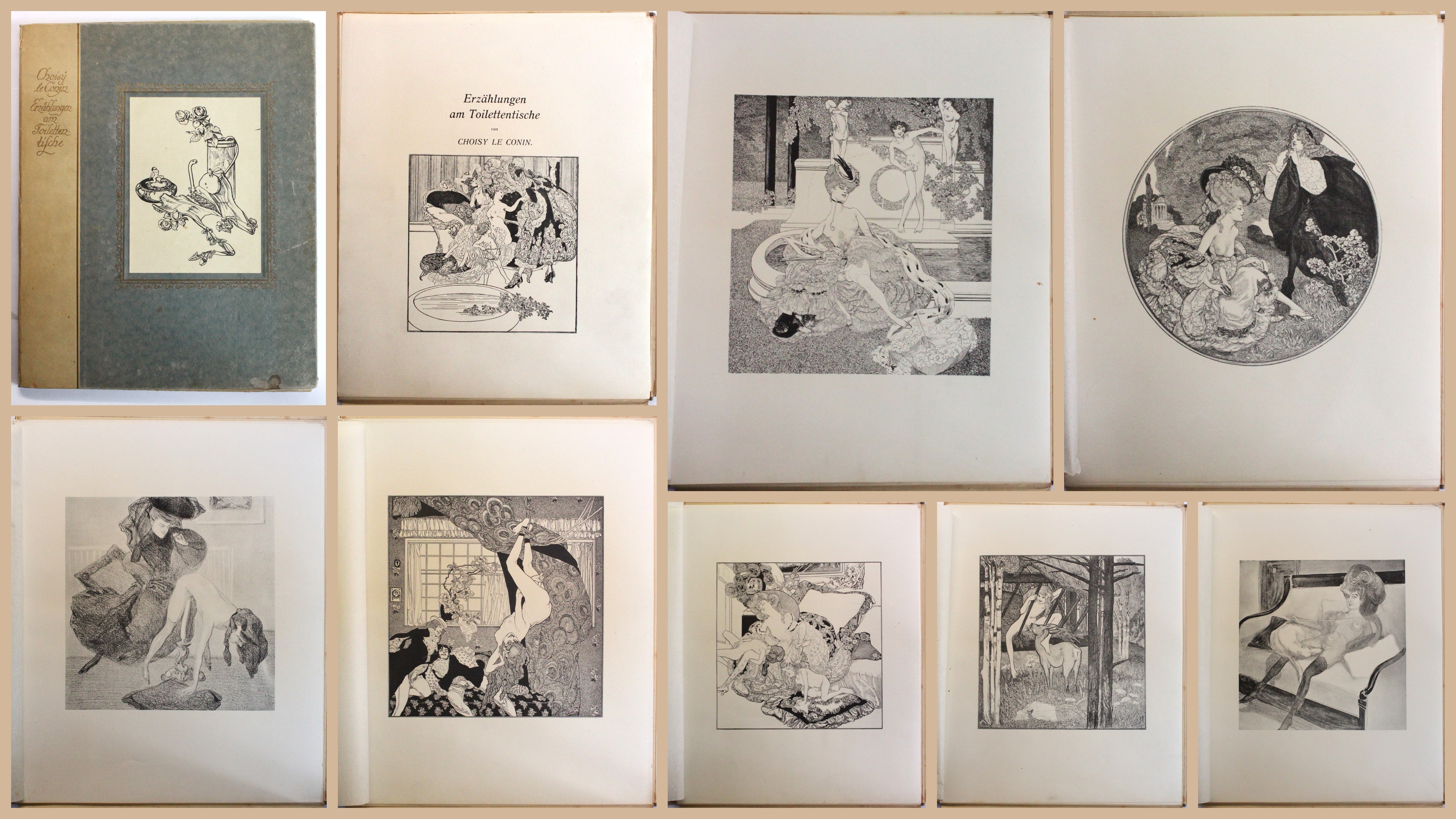 Conin, Choisy le [d.i. Franz von Bayros]. Erzählungen am Toilettentische. Mappe mit erotischen Grafiken. o.O., o.V., o.J. (1908). 4°, mit 15 Tafeln und einem illustrierten Titelblatt in Autotypie nach Zeichnungen von Bayros, Pp-Mappe mit montiertem Deckelbild. Hayn-G. IX, 45 ; Brettschneider 15 - Unnummeriertes Exemplar einer kleinen Auflage mit dem Vermerk "Nicht für den Handel". Franz von Bayros, der unter dem Pseudonym "Choisy Le Conin" dieses Werk veröffentlichte, war ein österreichischer Maler, Illustrator und Grafiker. Er war Mitglied der künstlerischen Bewegung "Fin de Siécle", die auf den damaligen kulturellen Verfall aufmerksam machten. Er schuf zahlreiche Werke und Illustrationen zu den Klassikern der erotischen Literatur. Zu seinen Werken zählen auch Motive mit Bezug zum Sadomasochismus und Bondage. Mappe etwas berieben, etwas fleckig bzw. angeschmutzt, Rücken bzw. Gelenk angeplatzt. Papier vereinzelt leicht fingerfleckig. Seltener Titel. Bestell-Nr: 6-0-12..........verkauft | ![]() | |