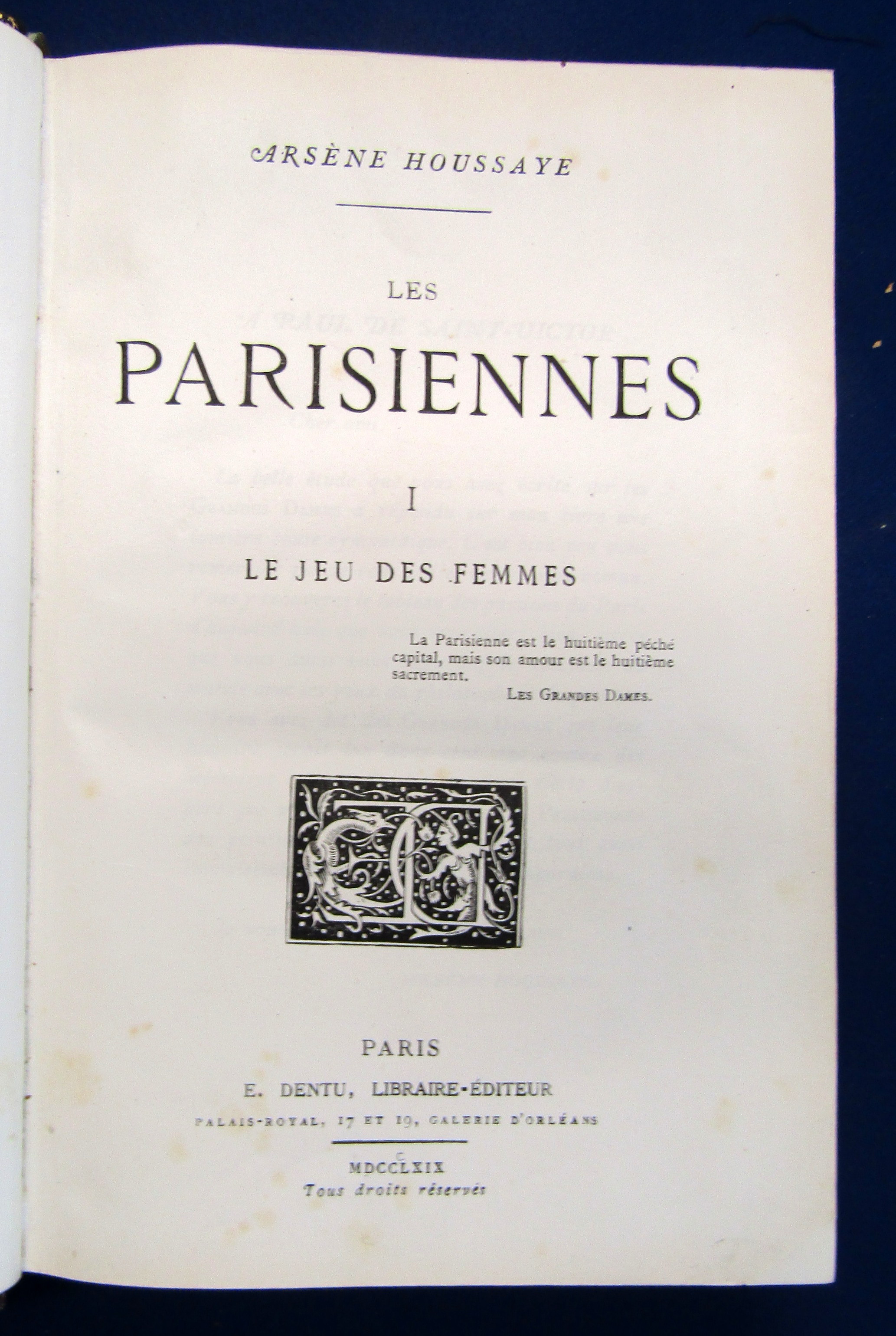 Arsène Houssaye. Les Parisiennes. 4 Bände (in 2). Paris, Dentu, 1869. gr. 8°; 367 S.; 1 Bl.; IV; 375 S.; 364 S.; 3 Bll.; 372 S.; 2 Bll.; Ganzlederbände d. Zt. mit Deckel- u- Rückenverg,. Steh- u. Innenverg., Kopfgoldschnitt. Les grandes dames, Sér. 2. - Nicht bei Monod u. Carteret - - Enthält I: Le Jeu des Femmes - II: Mademoiselle Phryne - III: Les Femmes Adulteres - IV: Les Femmes Dochues. Einbände leicht fleckig u. etwas berieben. Papier altersbedingt gebräunt, gelegentlich leicht fleckig. Gute Exemplare.. Bestell-Nr: 6-0-16..........verkauft | ![]() | |