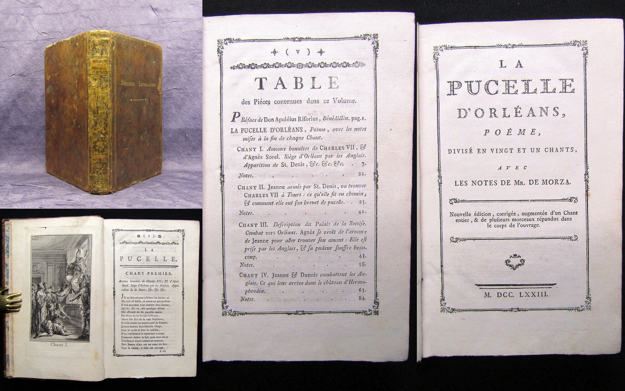 [Voltaire, François Marie Arouet de]. La Pucelle d'Orléans, poème, divisé en vingt et un chants. Avec les notes de Mr. de Morza. Nouvelle édition, corrigée, augmentée d'un chant entier, & de plusieurs morceaux répandus dans le corps de l'ouvrage [...]. [Genf], [o.Dr.], 1773. 8° (20x12,5cm), mit 21 erotischen Kupfern, VIII, 352 S; Ldr. d. Zt. Gay-Lemonnyer III, 887. Bengesco 499. Sander 2016 - Nachdruck der ersten von Voltaire autorisierten Ausgabe von 1762. Heroisch satirisches Versepos über die Jungfrau von Orleans, in der Voltaire die Glorifizierung der Jungfräulichkeit bloßstellt und karikiert. - Einband berieben, bestoßen, etwas beschabt. Papier etwas gebräunt, vereinzelt gering fleckig. Bestell-Nr: 6-0-21..........300,00 € (inkl. MwSt. zzgl. Versand) | ![]() |