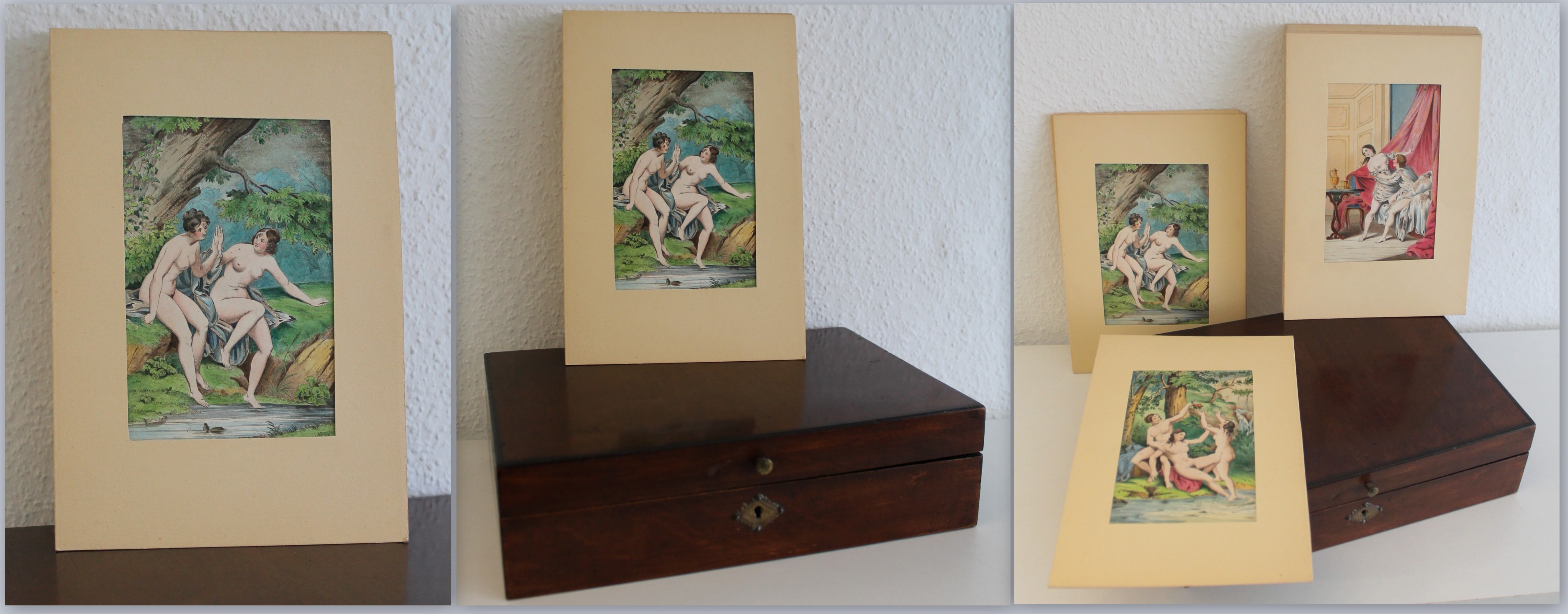 . Sammlung von 28 erotischen Stichen, davon 8 altkoloriert, jeweils auf festem Karton unter Passepartout montiert und in zeitgenössischer Biedermeier Holzschatulle verwahrt. o.O., o.Dr., um 1840. Holzschatulle: 7,5 x 26,6 x 19,0 cm; Plattengröße: je ca. 15,0 x 10,0 cm. Schatulle mit leichten Gebrauchsspuren, Papier sauber, bei wenigen alte Beschriftung minimal durchschlagend. Sehr schönes Exemplar einer aussergewöhnlichen Zusammenstellung leichter Erotica des Biedermeier. Bestell-Nr: 6-0-9..........verkauft | ![]() | |