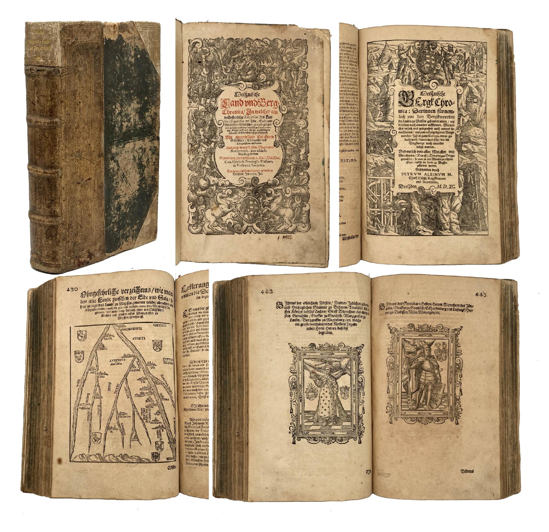 Albinus, Petrus. Meißnische Land und Berg-Chronica, in welcher ein vollnstendige description des Landes, so zwischen der Elbe, Sala und südödischen Behmischen gebirgen gelegen, so wol der dorinnen begriffenen auch anderer Bergwercken, sampt zugehörigen Metall un(d) Metallar beschreibungen. Dresden, Gimel Bergen, 1589-1590. 4° (ca. 31 cm x 20 cm), mit 2 Holzschn.-Titelbordüren, 2 Holzschn.-Ktn., 6 Portrait-Holzschn., 59 Wappen-Holzschn. u. 2 blgr. Portrait-Kupfern alles im Text. 6 Bl., 449 S., 7 Bl.; 4 Bl., 205 S., 3 Bl., blindgepr. Halbschweinsldr. d. Zt. VD16 W 1678. Ferchl 6. Graesse I, 59. Poggendorff I, 24. ADB I, 223 und IX, 195 (Gimel Bergen). NDB I, 151. Koch, Bergmännisches Schrifttum Nr. 11 und S. 49. - Zweiter Druck der zuerst 1580 bei Hans Lufft in Wittenberg erschienenen Chronik. Hauptwerk des Begründers der sächsischen Geschichtsschreibung Petrus Albinus (1543-1598), angeregt durch Georg Agricola, dessen Verehrer und Populisator er war. Band I enthält die Landchronik, Band II die Bergchronik mit einem ausführlichen Bericht über den Bergbau in Sachsen und anderen Ländern. "Das Werk ist das Ergebnis zahlreicher Reisen und landeskundlicher Forschungen, die auch viel hüttenchemische Nachrichten enthält (Quelle für das Leben Georg Agricolas)" (NDB). Neben der Annaberger Sammlung von bekannten Sprichwörtern das zweite der beiden verlegerischen Hauptwerke aus der Dresdener Offizin von Gimel Bergen, "kostbar ausgestattet" (ADB). Einband alt (ca. 1930) restauriert , stärker bereiben, Vorsätze und Spiegel mit Bütten erneuert, Papier durchgängig etwas gebräunt und teils etwas fleckig, vorn 16 Bll. oben mit kleinerer Eckbeschädigung und leichtem Wasserrand, 2. Teil im oberen Eckbereich mit Feuchteschädigung ab Seite 135 mit daraus resultierender Eckschädigung (ohne Text- oder Seitenzahlverlust nur im unbeschrieben Eckbereich), wenige Seiten mit schwachen alten Anstreichungen. Gesamt ordentliches und sammelwürdiges Exemplar des seltenen Titels. Bestell-Nr: 7-1-763..........zurückgestellt | ||