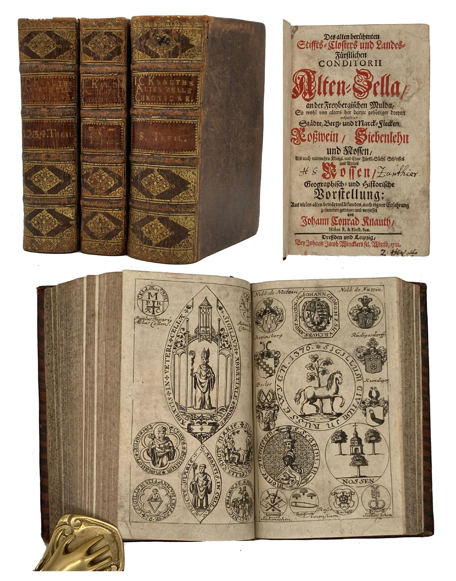 Anders, JCC. Das wegen seiner unterirdischen Schätze und überirdischen Kostbarkeiten glückliche und in aller Welt berühmte Königliche Freyberg in Meißen Oder JCC Anders kurutze und Deutliche Beschreibung Derer bay dieser in gantz Europa bekannten Haupt-Berg-Stadt berühmten Gebäude und Sehenswürdigkeiten, Worbey in Specie Von den Bergwercke und was davon zu wissen nöthig, Nachrichte zufinden. Chemnitz, Conrad Stößeln, 1725. kl. 8°, Mit einem gestochenen Frontispiz (Stadtansicht von Freiberg und Plan) und Vignette sowie Rundumgoldschnitt, Frontis, Titel, 2 Bll., 100 S., 3 Bll., Pergament. Einband leicht berieben. Papier alterbedingt im Rand leicht gebräunt. Insgesamt sehr gutes Exemplar der seltenen Ausgabe. Bestell-Nr: 7-1-416..........verkauft | ||