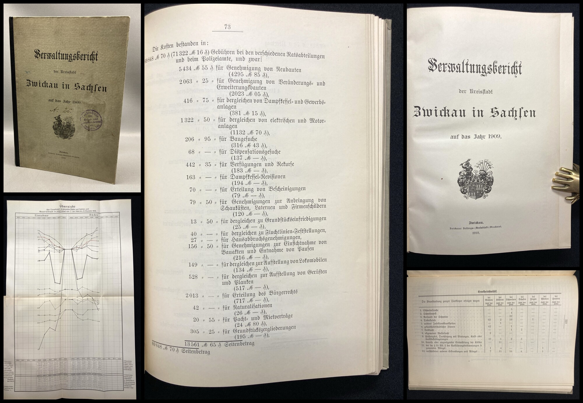 . Verwaltungsbericht der Kreisstadt Zwickau in Sachsen auf das Jahr 1909. Zwickau, Zwickauer Zeitungs(Amtsbaltt)- Druckerei, 1910. gr.8°(23x26cm), 303 S., 12 Bll., HLn.. Einband angeschmutzt, vorderer Deckel leicht gewölbt und gestempelt. Papier gering gebräunt. Bestell-Nr: 7-1-773..........130,00 € (inkl. MwSt. zzgl. Versand) | ||