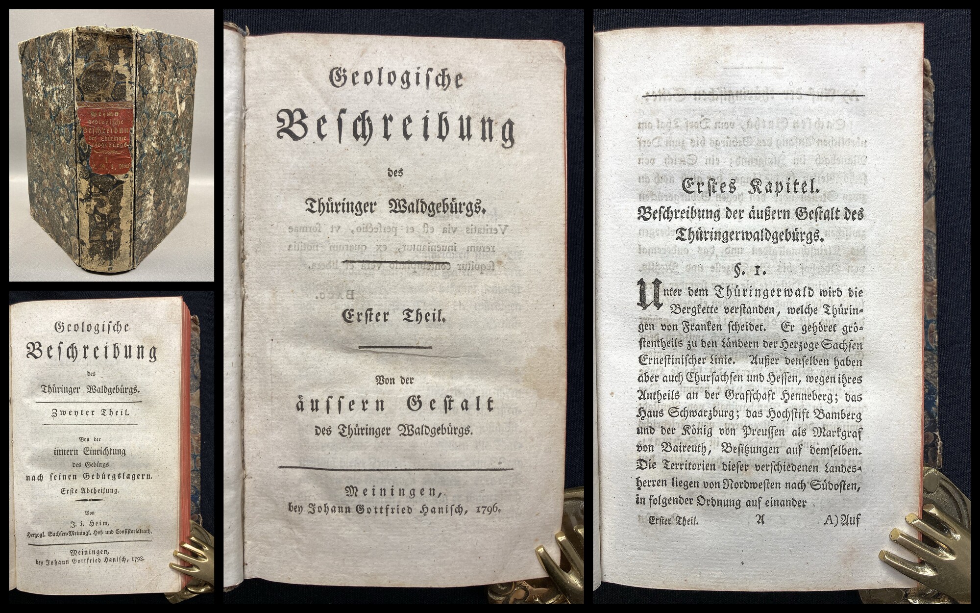 . Geologische Beschreibung des Thüringer Waldgebürgs. Teil 1+2( von 5). Meiningen, Johann gottfried Hanisch, 1796, 1798. kl.8°(17x10cm), L, 232 S., XVI, 360 S., Ppbd. mit RS. 1. Teil: Geologische Beschreibung des Thüringer Waldgebürgs. Teil 2: Von der innern Einrichtung des Gebürgs nach seinen Gebürgslagern. - Einband stärker beschabt und an den Ecken stärker bestoßen. Vorderes Vorsatzbll. oben rechts mit Eckabriss. Papier gering gebräunt. Bestell-Nr: 7-2-754..........280,00 € (inkl. MwSt. zzgl. Versand) | ||