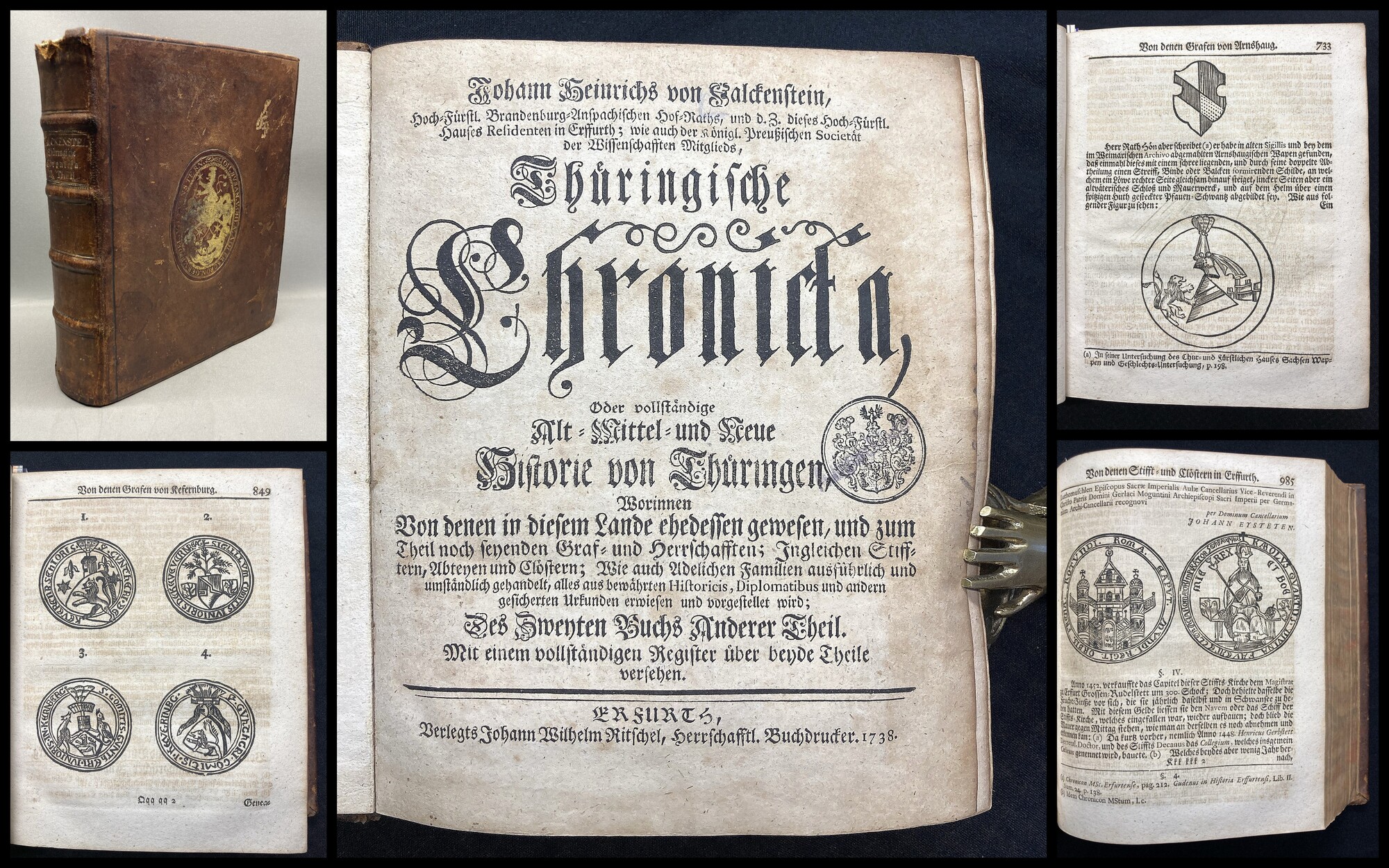 Sydow, Friedrich von. Thüringen und der Harz, mit ihren Merkwürdigkeiten, Volkssagen und Legenden. Historisch-romantische Beschreibung aller in Thüringen und auf dem Harz vorhanden gewesenen und noch vorhandenen Schlösser, Burgen, Klöster, merkwürdigen Kirchen und andere Gebäude; Fabrikörter, Bergwerke, Ruinen, Höhlen, Denkmäler, malerischen Gegenden und sonst beachtenswerther Gegenstände aus dem Reiche der Geschichte und Natur. 7 Bände & Ergänzungsband (zusammen 8 Bände, so vollständig). Sondershausen, Friedrich August Eupel, 1839-42. 8°, mit 82 lith. Tafeln und einem Holzschnitt (laut Tafelverzeichnis so vollständig), zus. ca. 2000 S., OPp. und HLn. Engelmann 981 - Einzige Ausgabe dieses sehr umfassenden Werkes. - Einbände berieben und bestoßen. Papierbedingt etwas gebräunt und etwas fleckig. Titel von Band 4 weist 12 Tafeln aus, das Tafelverzeichnis jedoch nur 11, welche allesamt vorliegen. der Ergänzungsband etwas abweichend gebunden. Titel jeweils und Tafeln verso mit alten Besitzstempeln. Insgesamt gutes Exemplar. Bestell-Nr: 7-2-586..........1.000,00 € (inkl. MwSt. zzgl. Versand) | ||