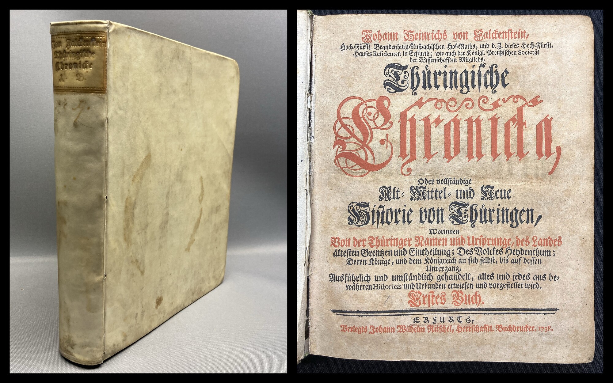 Treiber, M. Johann Friedrich. Geschlechts- und Landes- Beschreibung des durchlauchtigsten Hauses Schwarzburg, Sondershäusischer und Rudolstädtischer Linien; Darinne dieses hohen Hauses Personen nach Ihrem Ursprung und Lebens-Zeit erzählet; Hiernechst die Hochfürstl. Schwarzburgischen Lande und die darinne befindlichen Städte, Aemter, Schlösser, Flecken, Waldungen, Berge und Flüsse und a. m. kürzlich beschrieben werden [...]. Arnstadt, Johann Jacob Beumelburg, 1756. 8°, mit gest. Frontispiz, 11 nn. Bll., 168 S., 7 nn. Bll. (Register), HPrgt. im Stil d. Zt. Neue, umfangreich vermehrte Ausgabe, zuerst 1718 erschienen. Durchschossenes Exemplar mit zahlreichen hs. Eintragungen auf den zwischengebundenen Seiten. Vorsatz mit Bibliografischen Anmerkungen zu zeitgenössischen Schriften über Schwarzburg. Vorderer Spiegel mit hs. Namenszug. Papierbedingt durchgängig gebräunt, teils etwas (finger)fleckig. Gutes Exemplar des seltenen Titels. Bestell-Nr: 7-3-51..........verkauft | ||