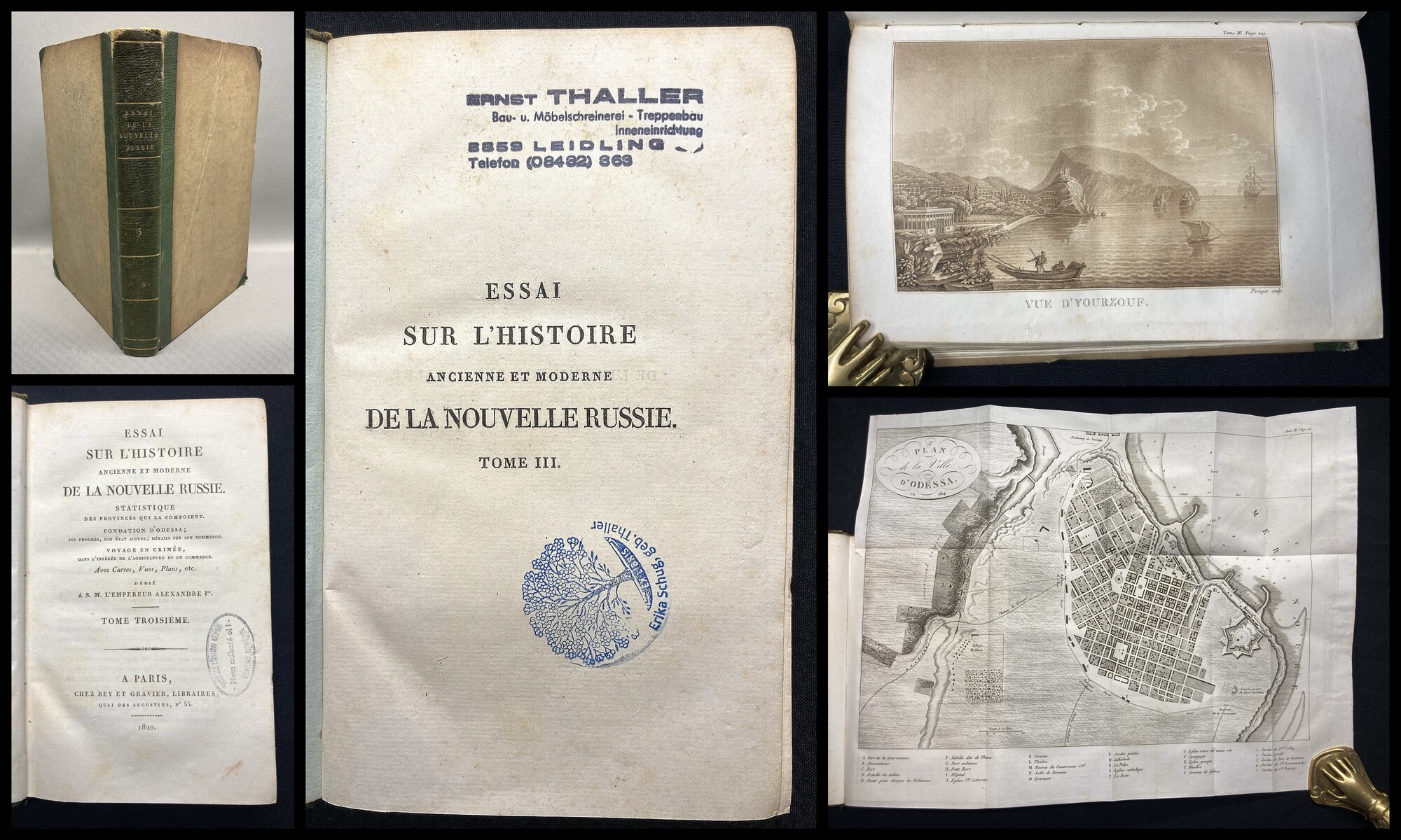 -. Gemeinnütziges Wochenblatt zur Kenntnis der Staaten. "Das russische Reich", 2 Bd.(alles). Dresden, Meinhold, 1793. 8°, 2 nn. Bll., 460 S.; 3 nn. Bll., 345 S., XVI (Register), Pp. d. Zt. mit RSch. Erste Ausgabe. Geschichtliche und landeskundliche Beschreibung Rußlands. Einbände etwas berieben und bestossen. Papier altersbedingt etwas gebräunt, minimal braunfleckig. Letzte Seiten in Bd. 2 mit schmalem Wurmgang im Bund, dadurch minimalster Buchstabenverlust. Sauberes, gutes Exemplar des seltenen Titels. Bestell-Nr: 7-3-54..........verkauft | ||