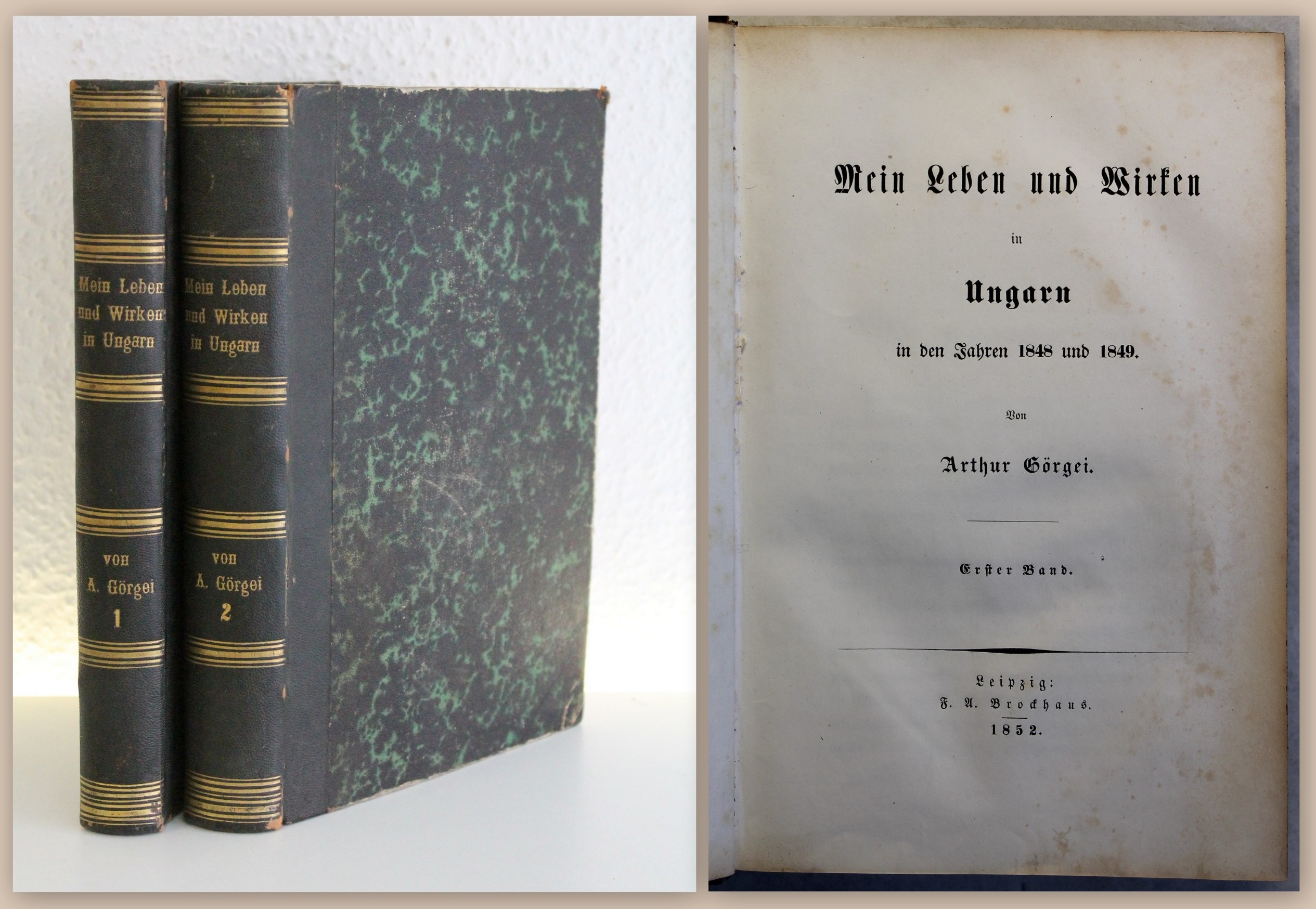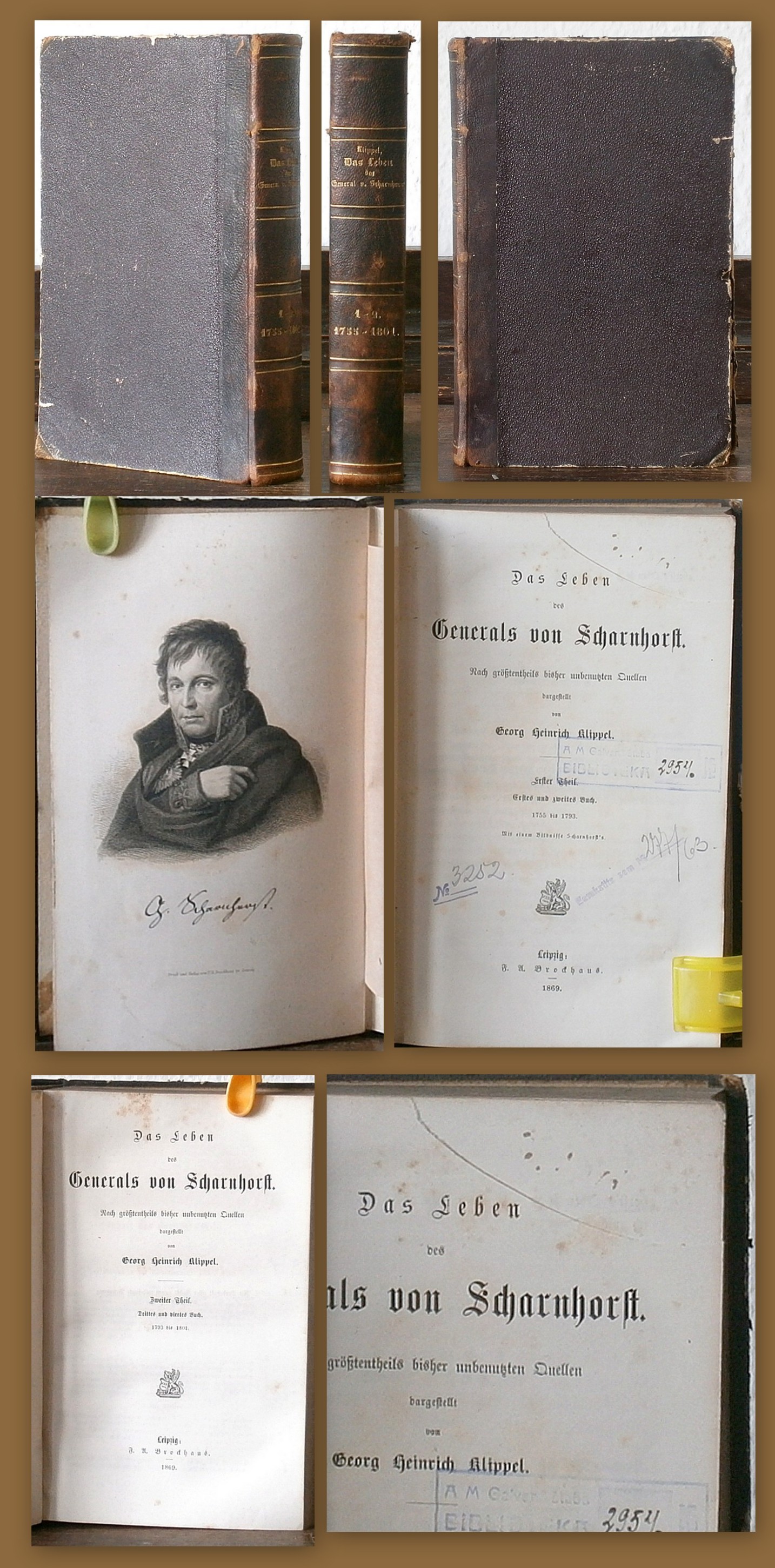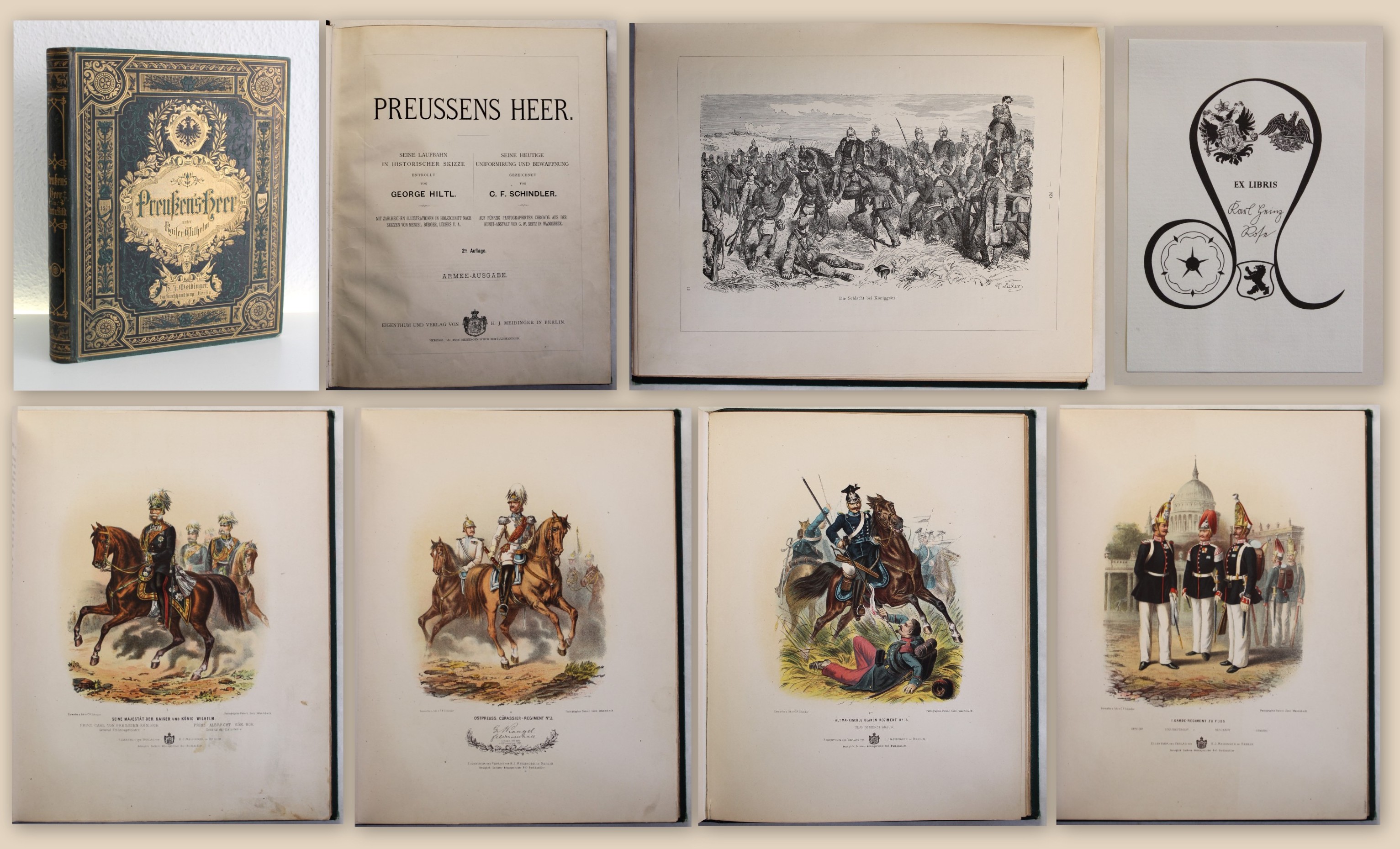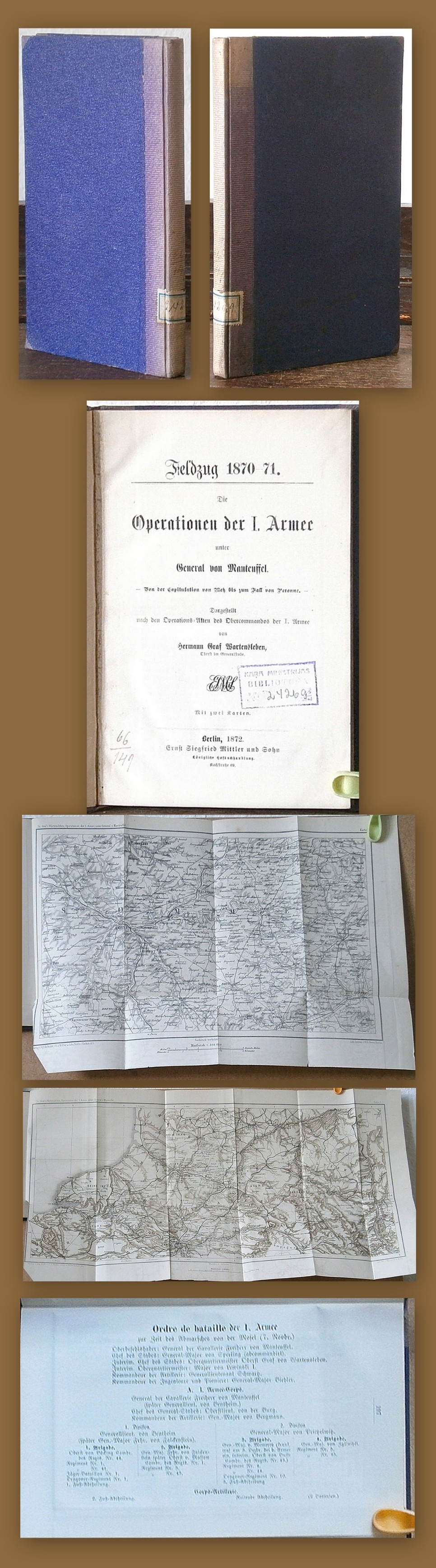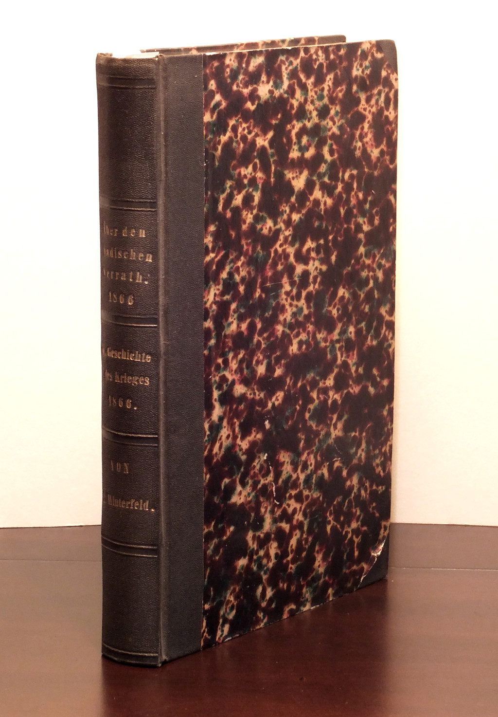verschiedene Autoren. Sammelband mit 6 Titeln zum Deutschen Krieg von 1866, beinhaltet: I) Winterfeld Karl. Vollständige Geschichte des Preußischen Krieges gegen Österreich und dessen Bundesgenossen [...] 5. Aufl.;II) [EMMERLING, E.]. Actenmäßige interessante Enthüllungen über den badischen Verrath an den deutschen Bundestruppen in dem soeben beeindigten preußisch -deutschen Kriege. 4. Auflage; III) [EMMERLING, E.]. Nochmals Der badische Verrath. - Weitere Enthüllungen sowie Zurückweisung der wider die bekannte Broschüre erschienenen officiellen und officiösen Angriffe.; IV) Anonym. Badische Antwort auf das Pamphlet über den angeblichen bad. Verrath an den deutschen Bundestruppen. Von einem Badener.; V) Prinz Alexander von Hessen. Feldzugs-Journal des Oberbefehlshabers des 8ten deutschen Bundes-Armee-Corps im Feldzuge des Jahres 1866 in Westdeutschland. 2. Auflage; VI) Anonym. Erläuterungen des Höchstkommandirenden der Südwestdeutschen Bundes-Armee zu dem im Buchhandel erschienenen Feldzugs-Journal Seiner Großherzoglichen Hoheit des Prinzen [...] im Feldzuge 1866. 2. Auflage. Berlin, Wien, Stuttgart, Lahr, Darmstadt & Leipzig, München, Versch. (Zamarski, Kleeblatt & Comp., Geiger, Zernin, Manz), 1866 / 1867. I) mit 2 Kartentafeln und zahlreichen Karten und Abbildungen im Text, 272 S.; 30 S.; 48 S.; 48 S.; 41S., 9 Bll.; 13 S., 1(w) Bl., HLn. d. Zt. mit goldgeprägtem Rückentitel. Interessanter Sammelband, welcher verschiedene Ansätze des deutsch-preußischen Krieges beleuchtet. Einband nahezu ohne Gebrauchsspuren. Papier sauber und frisch, Vorsätze etwas braunfleckig. Sehr gutes Exemplar . Bestell-Nr: 8-0-81..........verkauft | ![]() | |