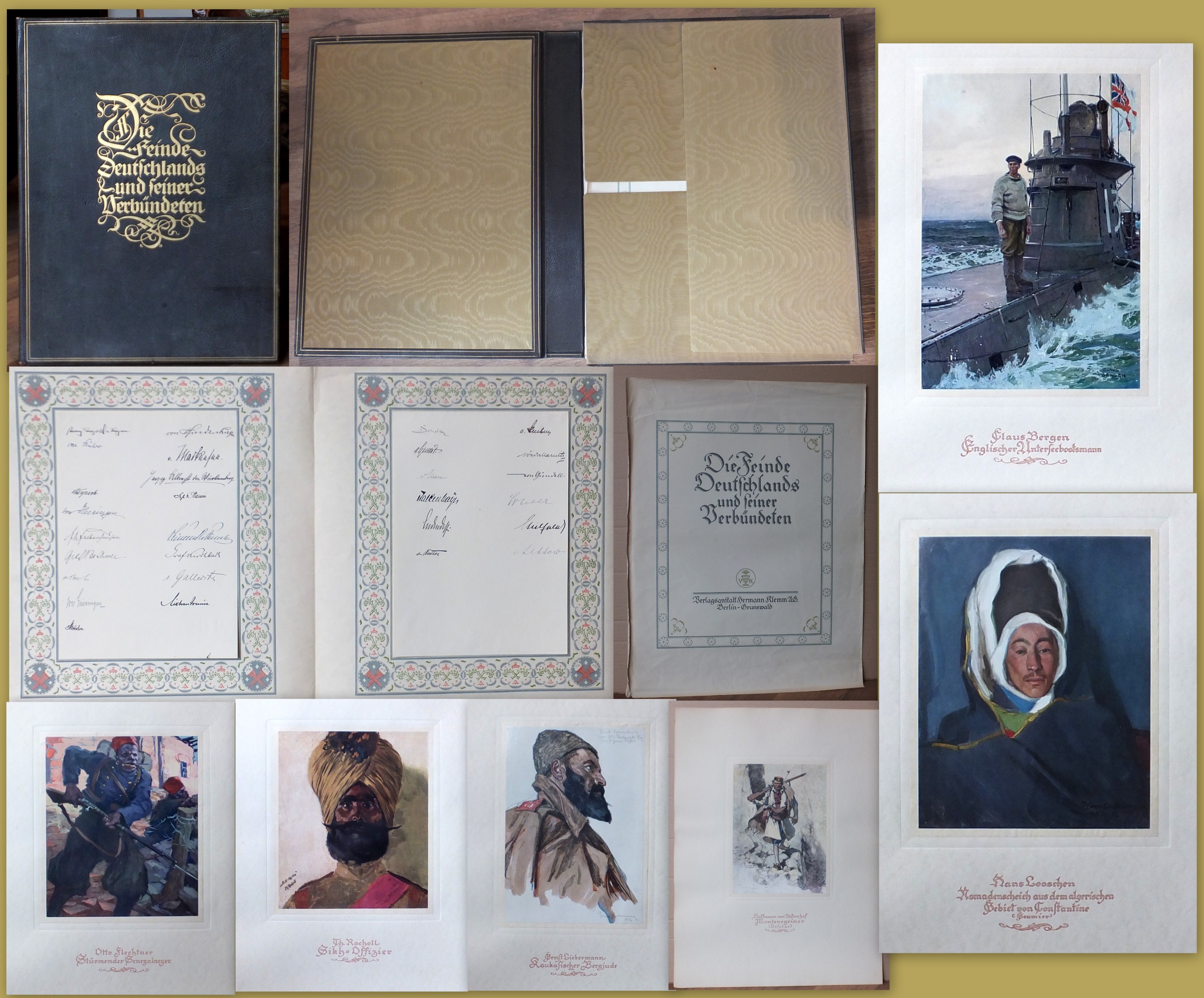 Vollbehr, Ernst. Bei der Heeresgruppe Kronprinz. Zweites Kriegsbilder-Tagebuch [...]. München, Bruckmann, 1917. gr. 8°, 1 Bl., 86 S., 5 Bll., original Ganzpergament. Erste Ausgabe. Eine kleine Zahl der Werke wurde als Vorzugsausgabe in Ganzpergament gebunden, sowie handschriftlich vom Verfasser signiert und nummeriert wurde, vorliegend Nr. 13. Einband mit sehr geringen Gebrauchsspuren, Deckel minimal aufgebogen. Papier sauber und frisch. Sehr gutes Exemplar.. Bestell-Nr: 8-0-218..........verkauft | ||