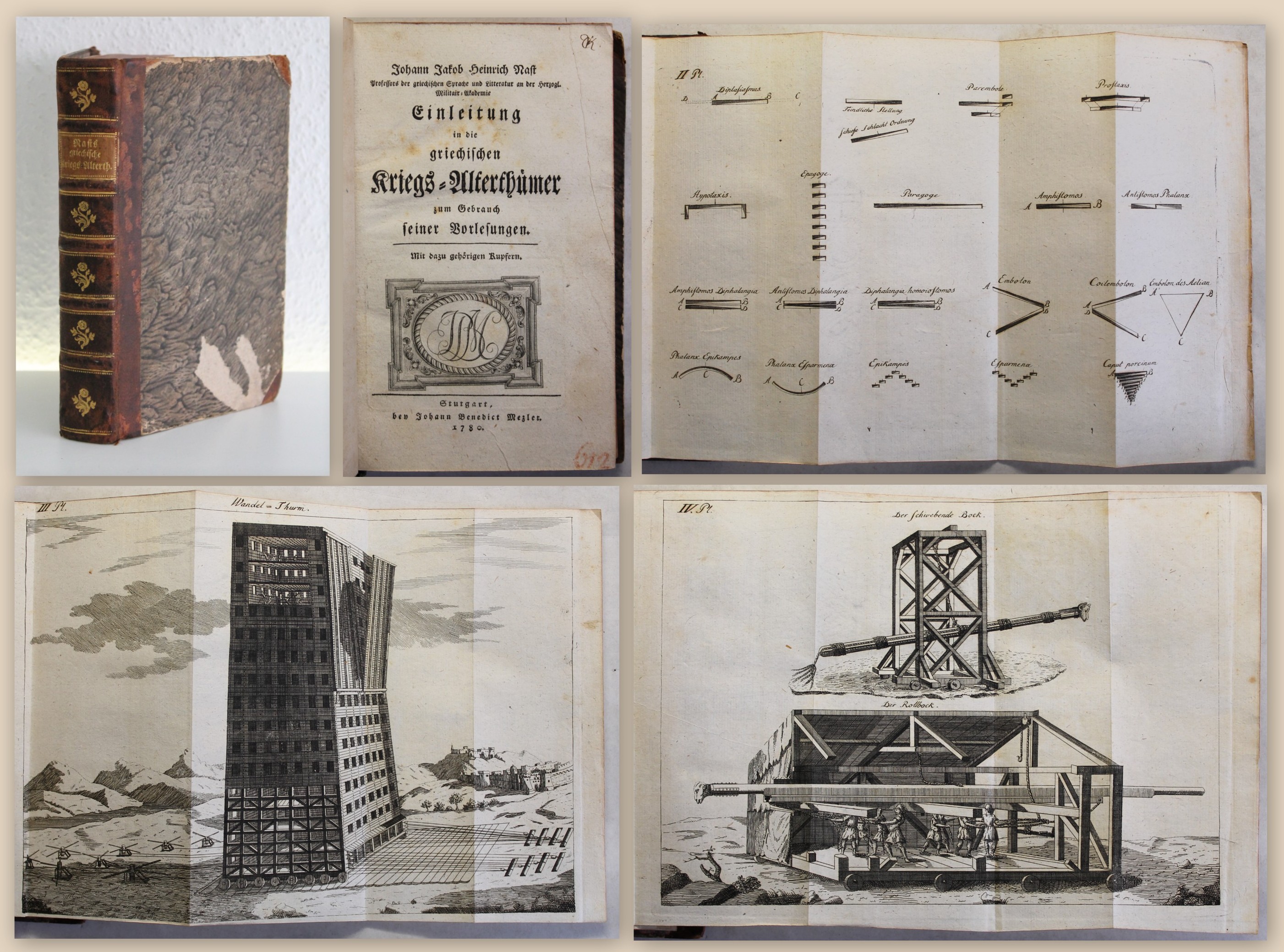 Vegetius, F.R.. De re militari libri IV. Leiden, Platin, 1592. kl 8°(18x13cm), Titelvignette, mit Kupfern und Faltplan, 8 Bll., 320 S., 480 S., 31 Bll., Pergamenteinband d. Zt. mit spanischen Kanten. Ebert II/23444 - Der Klassiker der militärischen Literatur in der von Stewech besorgten Ausgabe. Von besonderem Interesse sind die III. zu Stewechs Kommentar, die zu den frühen techn. Darstellungen im Buchdruck überhaupt zählen. Vegetius ist der erste militär. Schriftsteller, der über alle Zweige der Kriegskunst geschrieben und den größten Einfluß auf das Kriegswesen des Mittelalters geübt hat. - Einband berieben und bestoßen, rotes hs. Rs., Deckel braunfleckig, letzte Seiten leicht wurmspurig, Papier altersbedingt leicht gebräunt . Bestell-Nr: 8-0-539..........1.500,00 € (inkl. MwSt. zzgl. Versand) | ||