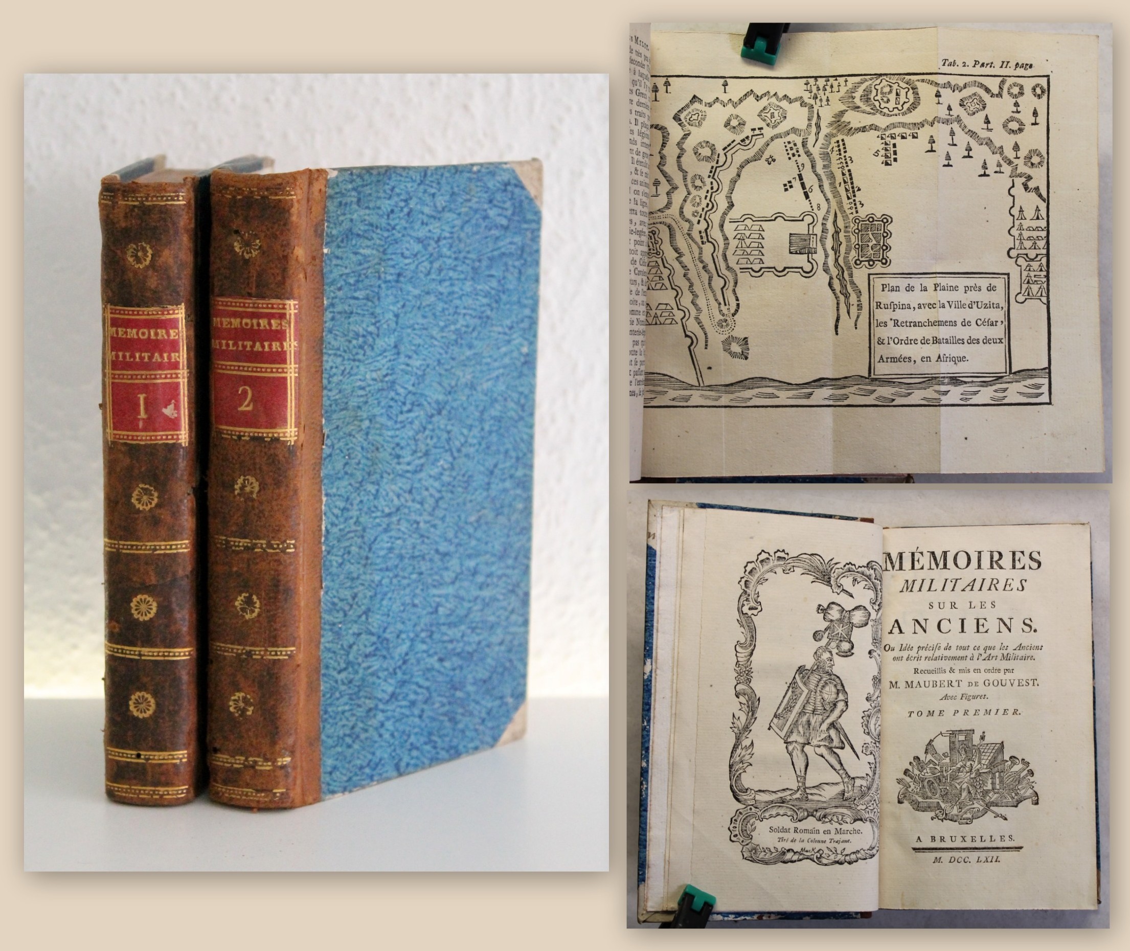 Turpin de Crisse, Lancelot. Essai sur l`art de la guerre. 2 Bde. in 1. Paris, Prault u. Jombert, 1754. gr. 4°, mit 2 gest. Titelvign., 11 gest. Vign. (Militärszenen) und 25 gefaltenen Kupfern v. Dheulland, 2(w), 27 Bll., 443 S., 2 Bll., 4 S., 204 S., Ldr. d. Zt. mit reicher Rückenvergoldung. Brunet V, 982. Hoefer XLV, 744. - Quérard, La France littéraire, IX, 584NA - Erste Ausgabe des Hauptwerks von Graf Turpin de Crisse (1716-1795). Sein Werk "Die Kriegskunst" wurde sehr geschätzt. Es erschien auch in deutscher, englischer und russischer Übersetzung. - Einband etwas berieben, kaum bestoßen, Kapitale und Rücken mit normalen Nutzungsspuren. Rücken mit goldgesprägten Initialen "C.B.B.", vorderer Deckel mit Initialen "C.G.L.". Papier etwas gebräunt, vereinzelt leicht braunfleckig. S. 165/166 mit Eckabschnitt im weißen Rand ohne Textberührung. Insgesamt sehr wohlerhaltenes und dekoratives Exemplar. Bestell-Nr: 8-0-337..........800,00 € (inkl. MwSt. zzgl. Versand) | ||