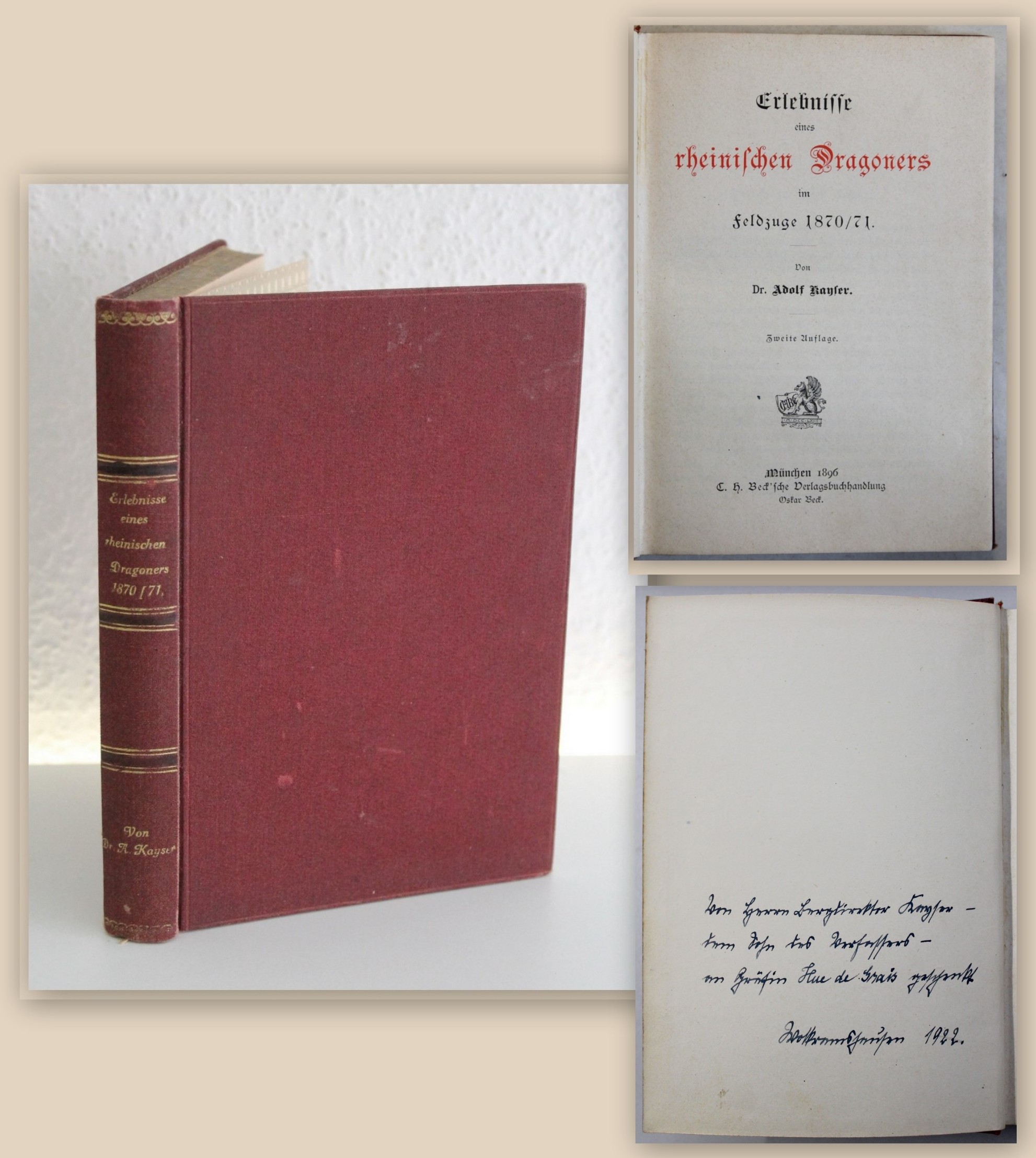 Albert, C. Deutschlands Krieg gegen Frankreich 1870 und 1871. Eine Chronik zur Erinnerung an deutsche Kraft und deutsche Treue. Dresden, Lohse, um 1871. gr. 8°, mit 36 altkolorierten Lithografien, 2 Bll., 864 S., HLdr. d. Zt . Unter den Tafeln Ansichten von: Wilhelmshöhe, Sprengung d. Rheinbrücke bei Kehl, Bazeilles b. Sedan, Strassburg nach der Beschießung u. zahlr. Schlachten u. Gefechten. Einband berieben, etwas beschabt und bestoßenm Papierbezug mit kleinen Fehlstellen. Papier gebräunt, teil etwas braunfleckig, Spiegel leicht stockfleckig. Wenige Seiten mit Einrissen, 1 Seite mit kleinem Loch, dadurch etwas Buchstabenverlust. Insgesamt wohl erhaltenes Exemplar des überaus seltenen Titels. Bestell-Nr: 8-2-300..........550,00 € (inkl. MwSt. zzgl. Versand) | ||