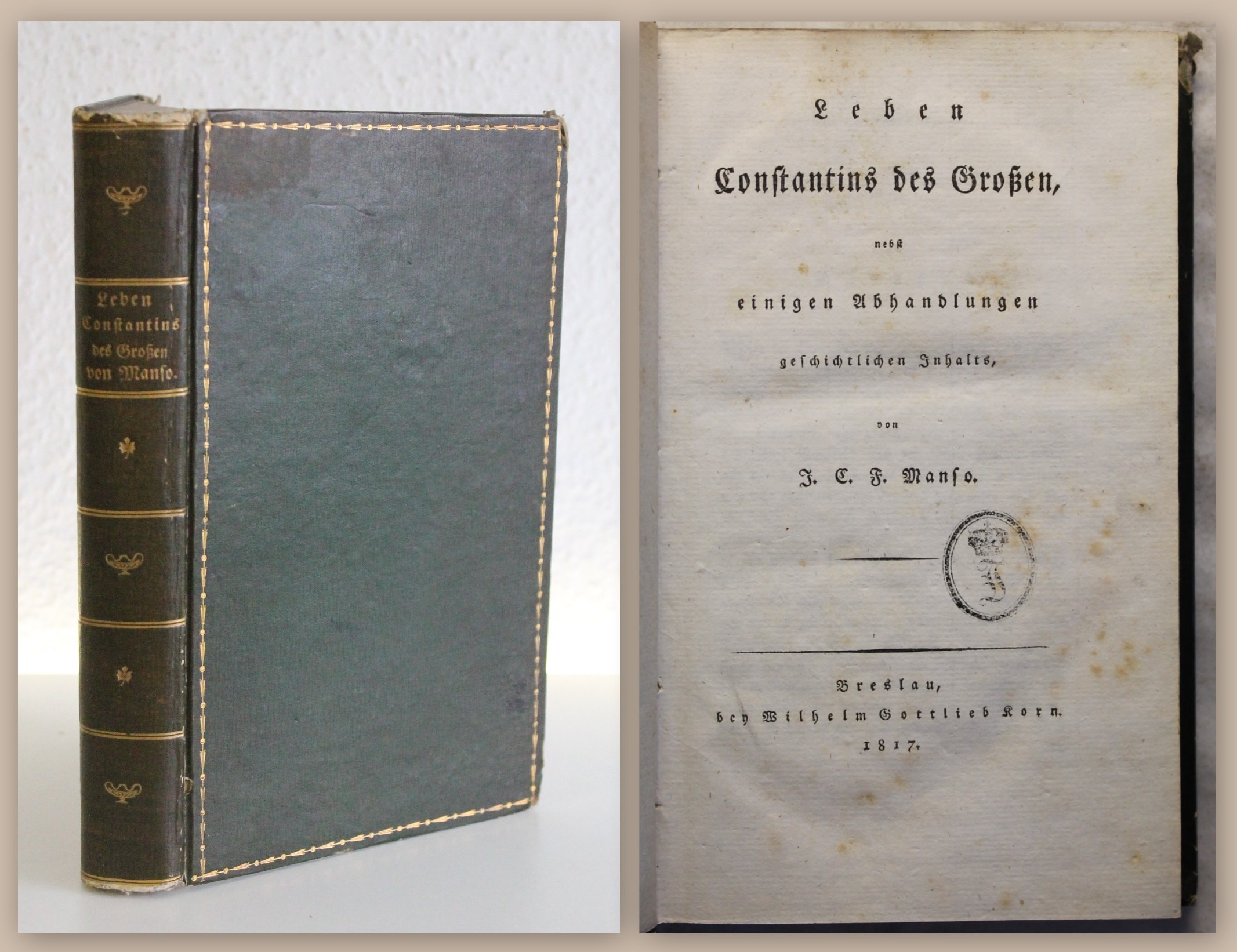 [Anonym]. Lebens-Beschreibung des Ersten Teutschen Kaysers Caroli des Grossen : vorstellend Sowohl dessen mit unterschiedlichen Völckern glücklich geführte Kriege, Stifftungen, und andere sonderbahr-merckwürdige Verrichtungen, als auch verschiedener Nationen, Länder, Städte, Flüsse und Ströhme Ursprung, Beschaffenheit, Sitten und Gewohnheiten: Insonderheit eine accurate Abbildung des alten Sachsen-Landes / Aus denen bewährtesten Autoribus, wovon in dem Vorberichte gehandelt wird, zusammen gezogen, mit wahrhaffter Feder entworffen, und auf vieler Verlangen zum Druck befördert [...]. Hamburg, Wierings Erben, o.J. (1723). 8°, 2 (w), 8 nn. Bll., 384 S., 4 nn. Bll., 2(w), Pgmt. d. Zt mit Rückenschild. VD18 11541113 - Sehr seltene Beschreibung Karl des Großen. - Einband etwas berieben, kaum bestoßen, Papier etwas gebräunt, vereinzelt etwas braunfleckig. Sehr gutes Exemplar.. Bestell-Nr: 8-2-492..........verkauft | ||