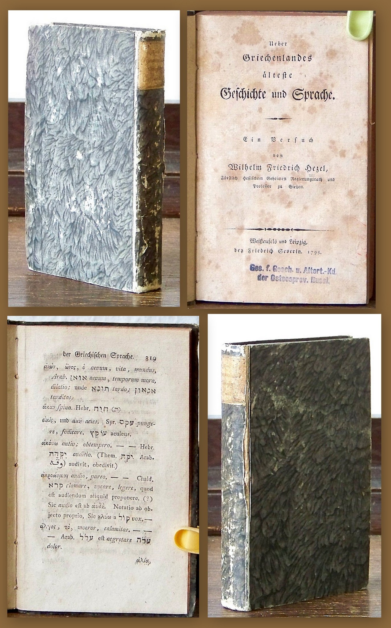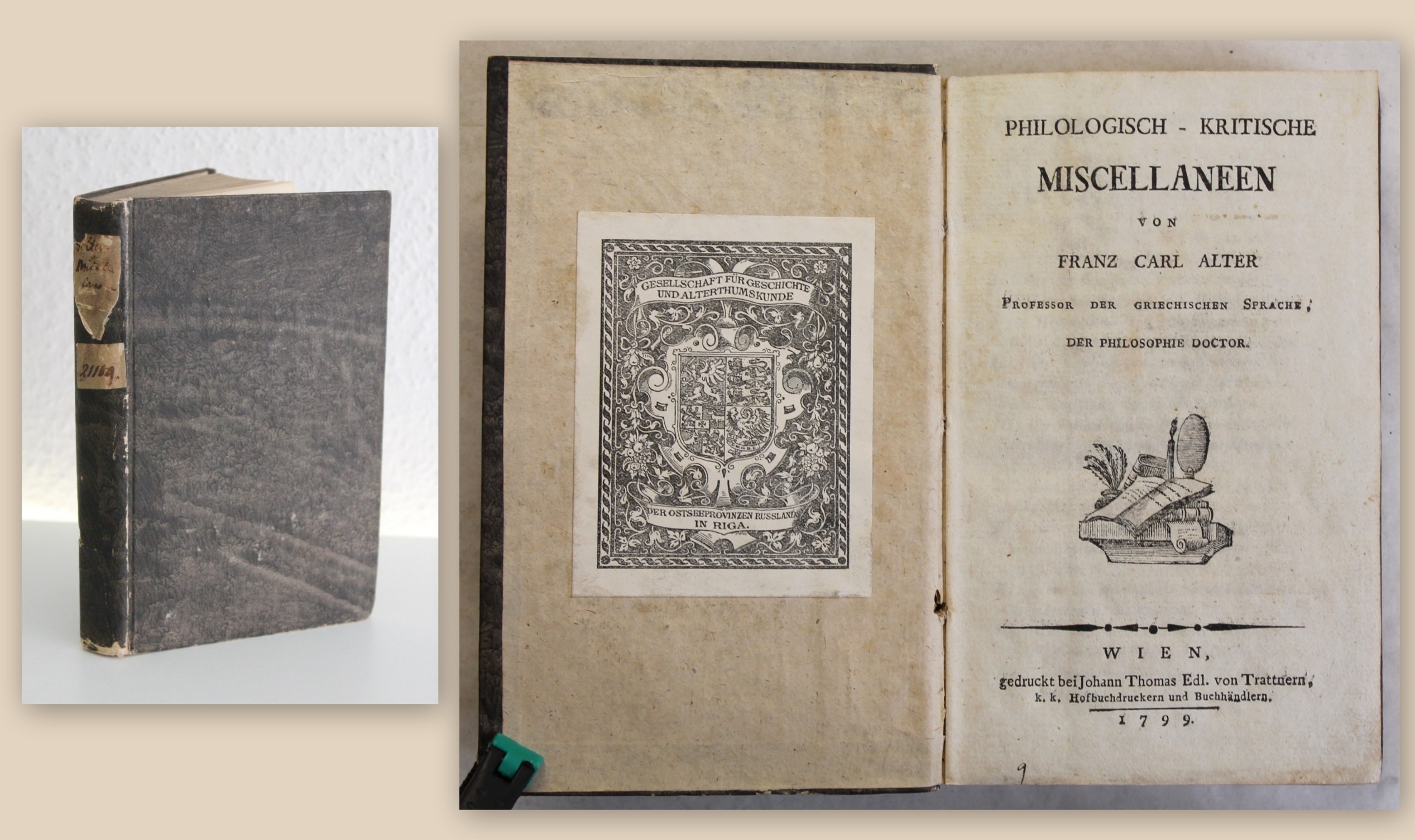 Alter, Franz Carl. Philologisch-kritische Miscellaneen. Wien, Johann Thomas Edl. von Trattnern, 1799. 8°. Ill. Titel. 2 nn. Bll., 258 S., 1 nn. Bl. Pp. d. Zt. mit Rsch. Doktor der Philosophie und Sprachwissenschaftler Alter gibt einen kritischen, philologischen Überblick über die Besonderheiten Slavischer, Griechischer etc. Sprachkulturen, Inschriften etc. Pp. d. Zt. etwas bestoßen. Auf dem Spiegel mit geklebtem Verweis auf die Gesellschaft für Geschichte und Alterthumskunde in Riga, Papier wenig gebräunt und nur vereinzelt minimal braunfleckig. Gutes Exemplar. Bestell-Nr: 8-0-25..........verkauft | ![]() | |
