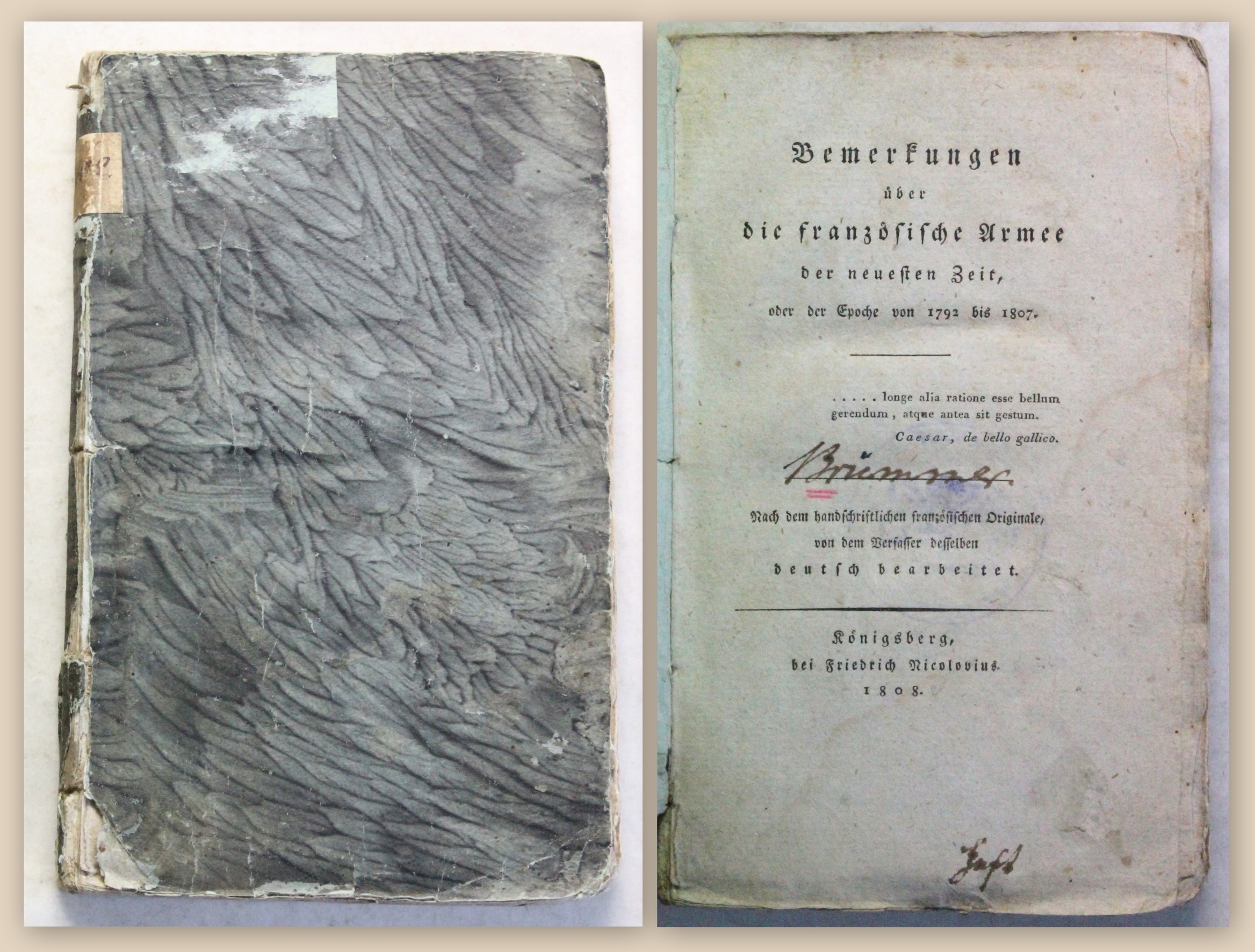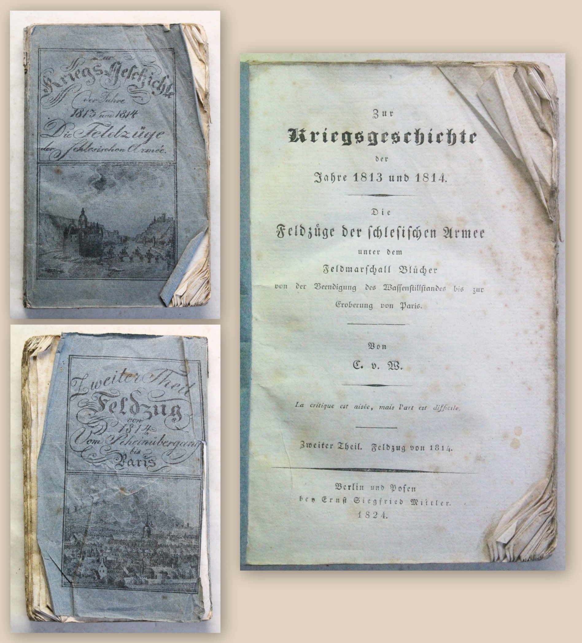 W., C. v. [d.i. Friedrich Carl Ferdinand von Müffling]. Zur Kriegsgeschichte der Jahre 1813 und 1814. - Die Feldzüge der schlesischen Armee unter dem Feldmarschall Blücher von der Beendigung des Waffenstillstandes bis zur Eroberung von Paris [...] Zweiter Theil. Feldzug von 1814. Berlin, Ernst Siegfried Mittler, 1824. 8°, 3 nn. Bll., 145 S., ill. OBrosch. Erste Ausgabe. In sich geschlossener 2. Teil. Broschur knittrig und etwas fleckig, Hinteres Broschurblatt fast gelöst. Papier unterschiedlich stark gebräunt und braunfleckig, zu Beginn und Ende stärker. Die Seiten aufgrund der weichen Broschur fast durchgehend eselsohrig. Bestell-Nr: 8-0-51..........verkauft | ![]() | |