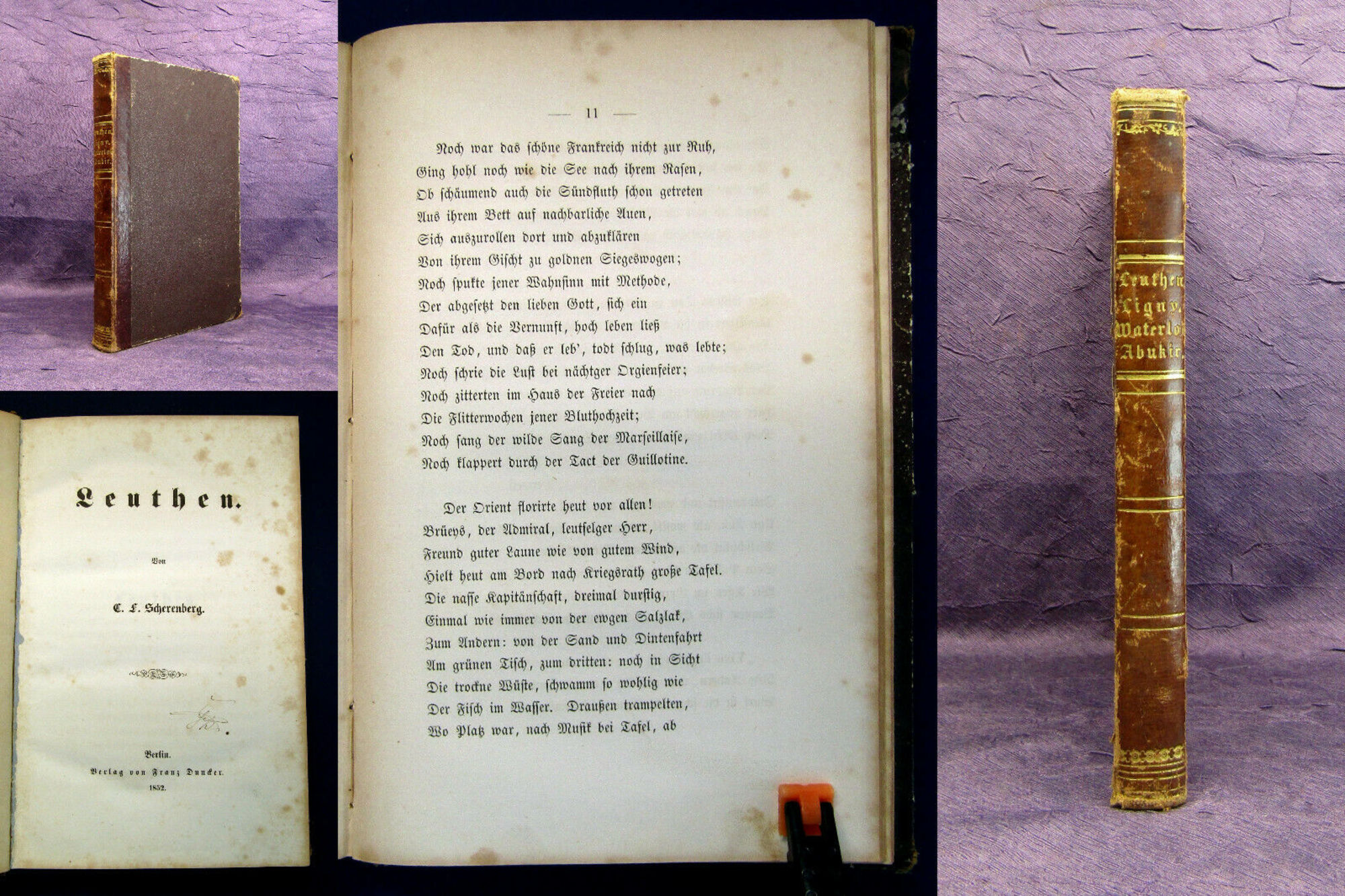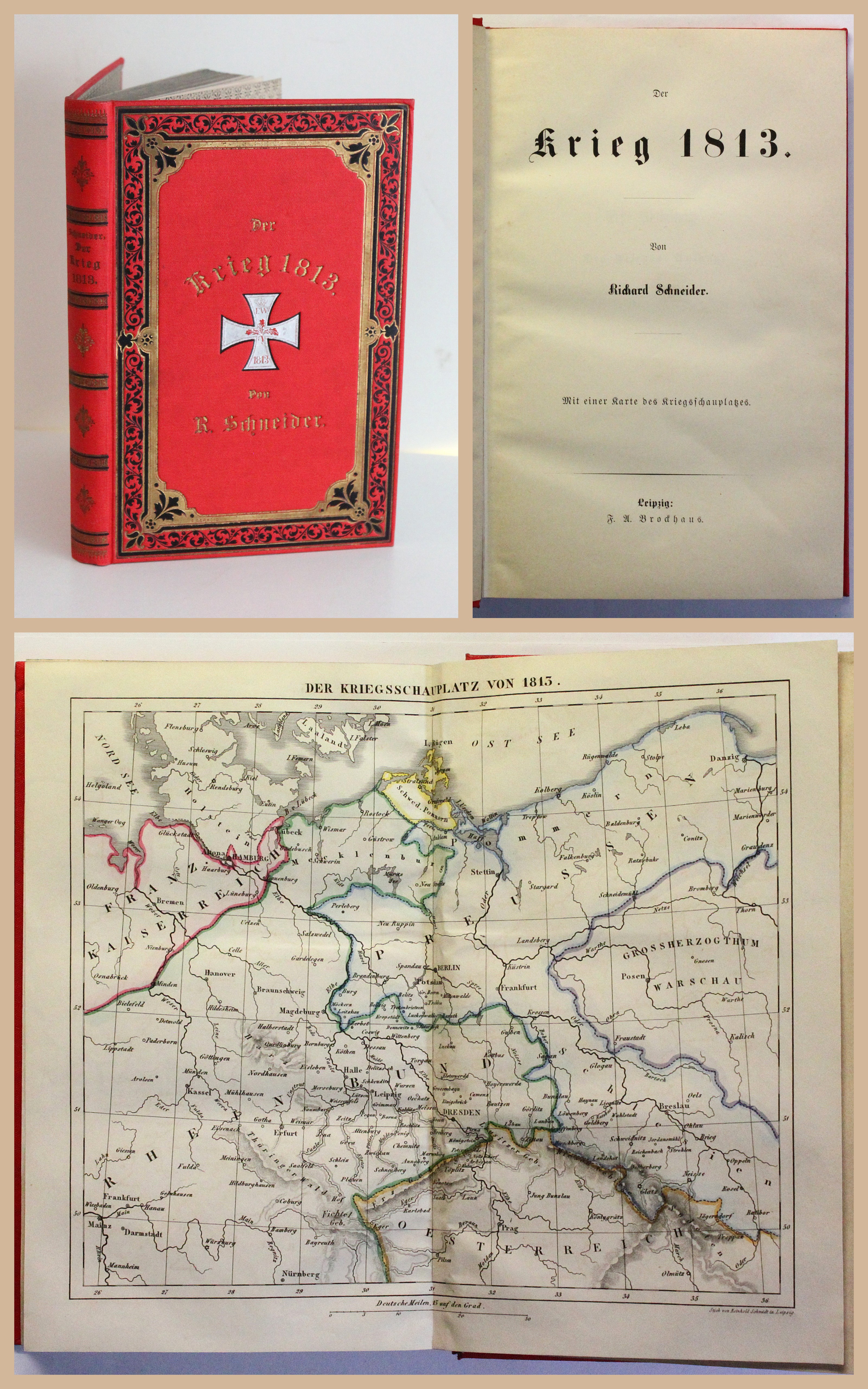 Schneider, Richard. Der Krieg 1813. Leipzig, F.A. Brockhaus, o.J. (um 1870). 8°, mit einer gestochenen, von Hand colorierten Karte von Reinhold Schmidt, Titel, 1 Bl., 412 S., gold-, silber- und blindgeprägter OLn. Einzige Ausgabe des sehr seltenen Titels zum Thema Napoleonische Befreiungskriege, welche ihren Höhepunkt bei der Völkerschlacht von Leipzig fanden. Nicht im deutschen KVK nachweisbar. Einband nahezu ohne Gebrauchsspuren. Papier im Rand minimal gebräunt. Sehr schönes Exemplar. Bestell-Nr: 8-0-273..........reserviert | ![]() | |
